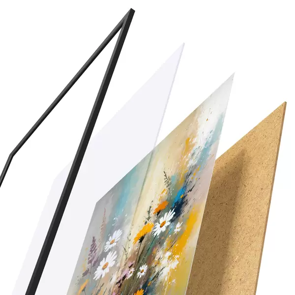 Le poster se compose d'un cadre, d'un plexiglas, d'une image imprimée et d'un support en aggloméré. Le poster peut être immédiatement accroché au mur grâce aux fixations au dos.