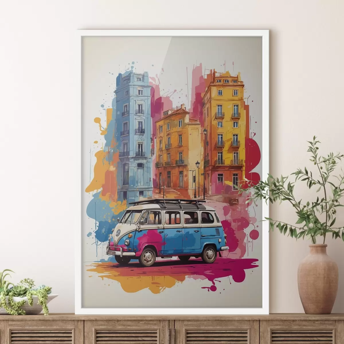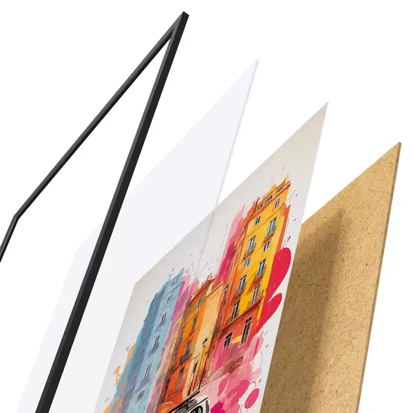 Le poster se compose d'un cadre, d'un plexiglas, d'une image imprimée et d'un support en aggloméré. Le poster peut être immédiatement accroché au mur grâce aux fixations au dos.