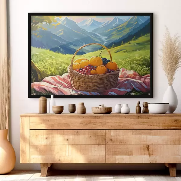 Affiche une corbeille de fruits sur un pré dans les montagnes f38654