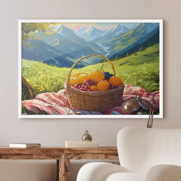 Affiche une corbeille de fruits sur un pré dans les montagnes Non f38654