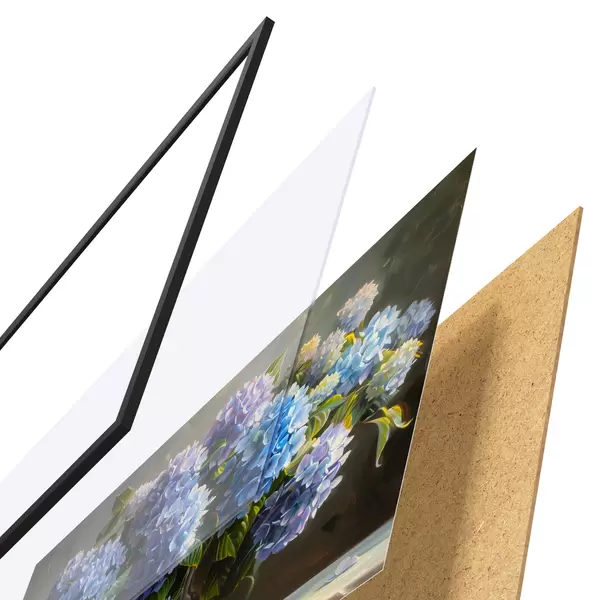 Le poster se compose d'un cadre, d'un plexiglas, d'une image imprimée et d'un support en aggloméré. Le poster peut être immédiatement accroché au mur grâce aux fixations au dos.