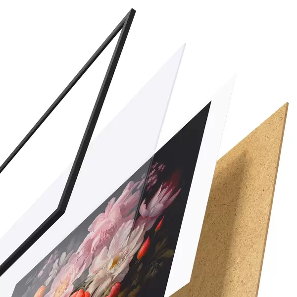 Le poster se compose d'un cadre, d'un plexiglas, d'une image imprimée et d'un support en aggloméré. Le poster peut être immédiatement accroché au mur grâce aux fixations au dos.