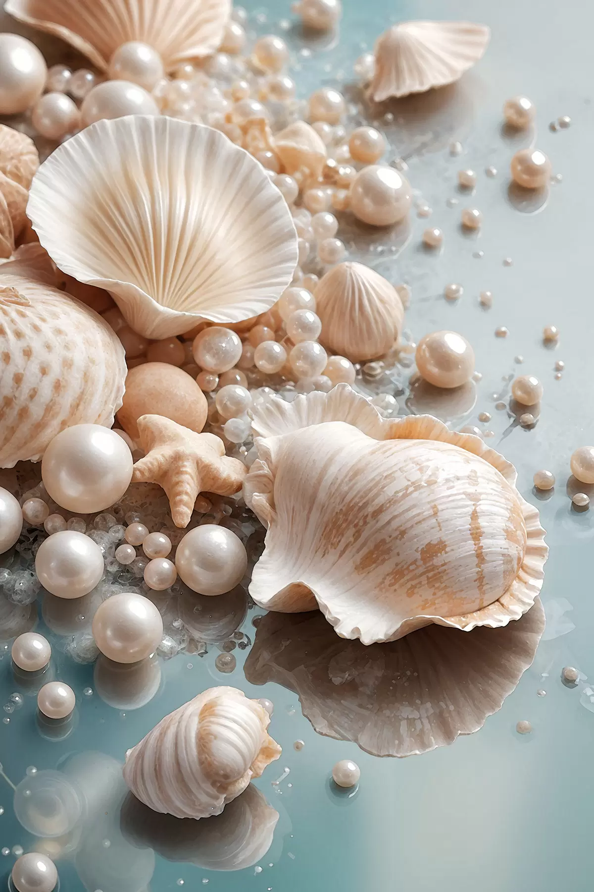 Affiche Assortiment de coquillages et de perles sur fond bleu clair Non f38769