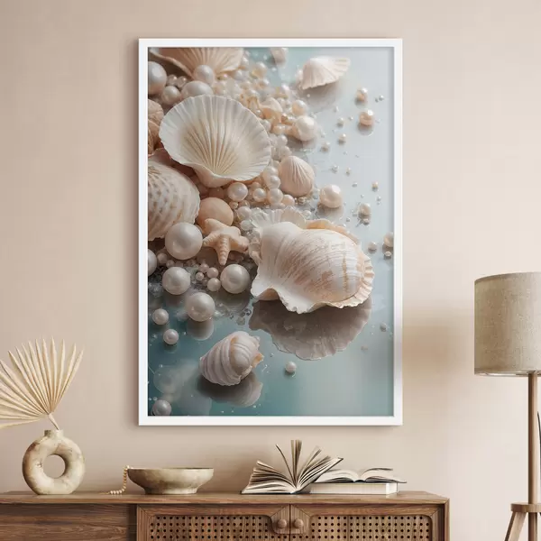 Affiche Assortiment de coquillages et de perles sur fond bleu clair f38769