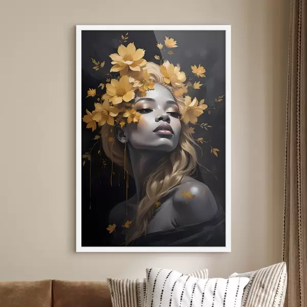 Affiche Portrait d'une jeune femme entourée de feuilles jaunes d'automne sur fond sombre Non f38834