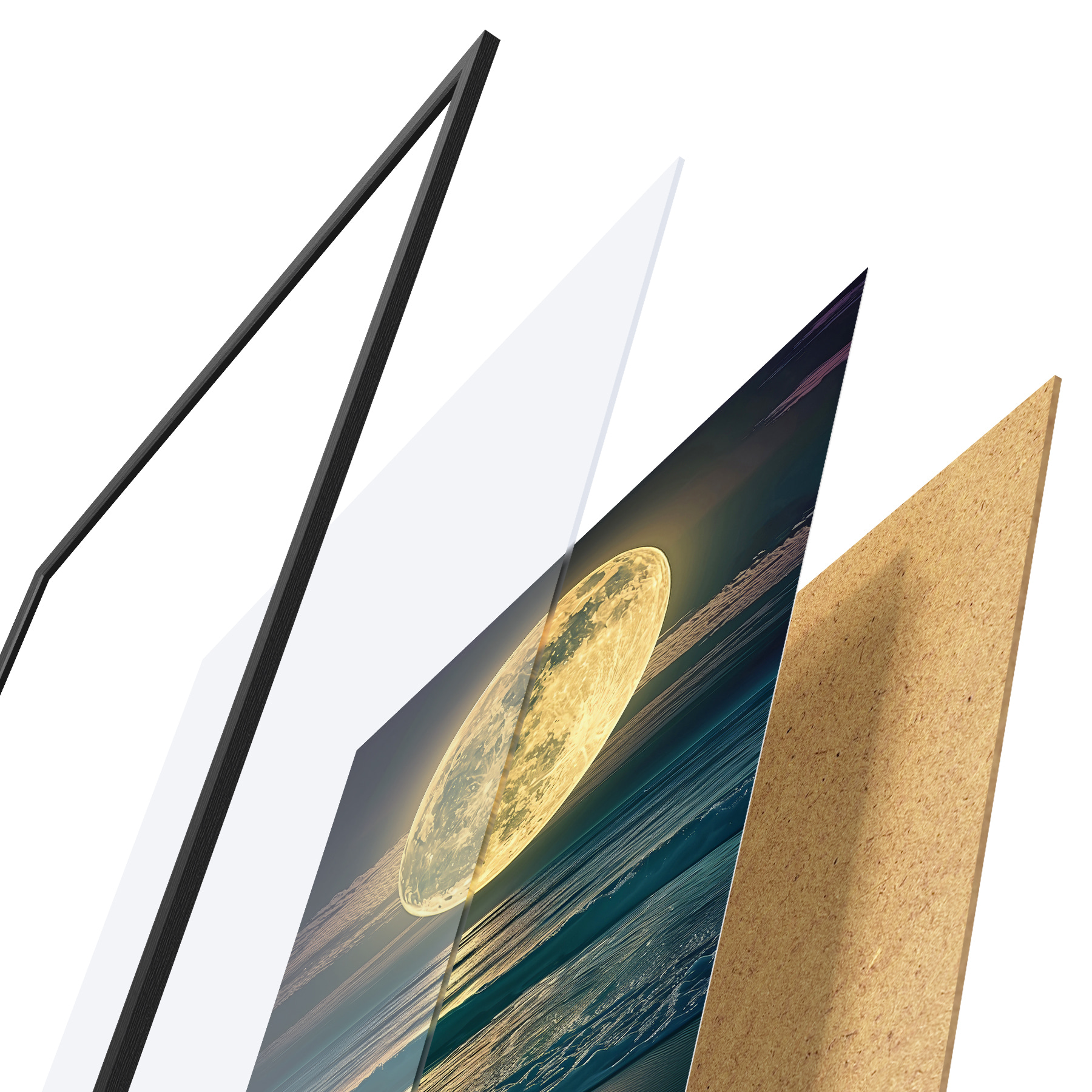 Le poster se compose d'un cadre, d'un plexiglas, d'une image imprimée et d'un support en aggloméré. Le poster peut être immédiatement accroché au mur grâce aux fixations au dos.