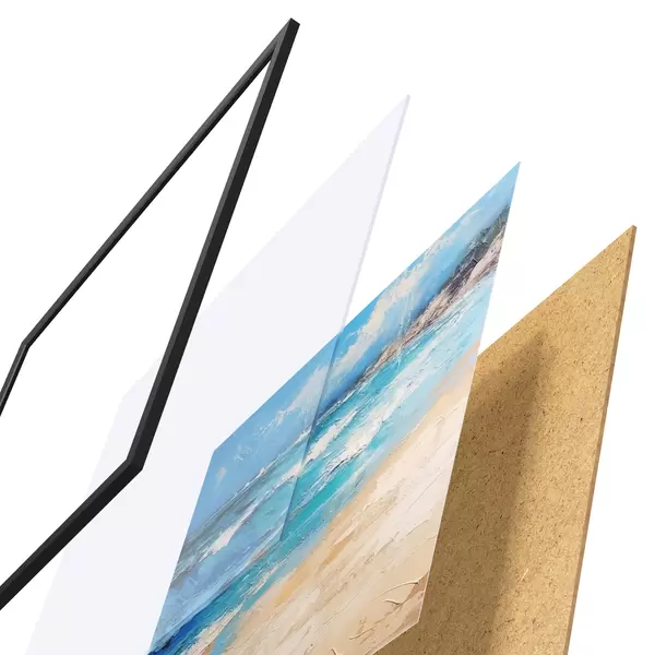 Le poster se compose d'un cadre, d'un plexiglas, d'une image imprimée et d'un support en aggloméré. Le poster peut être immédiatement accroché au mur grâce aux fixations au dos.