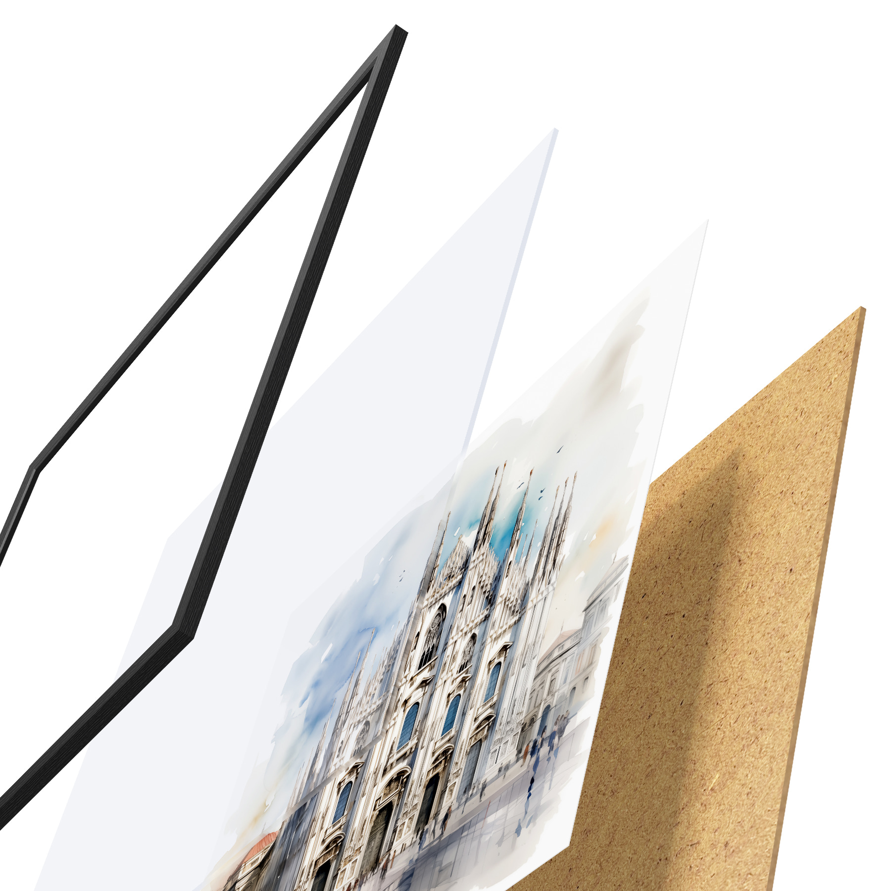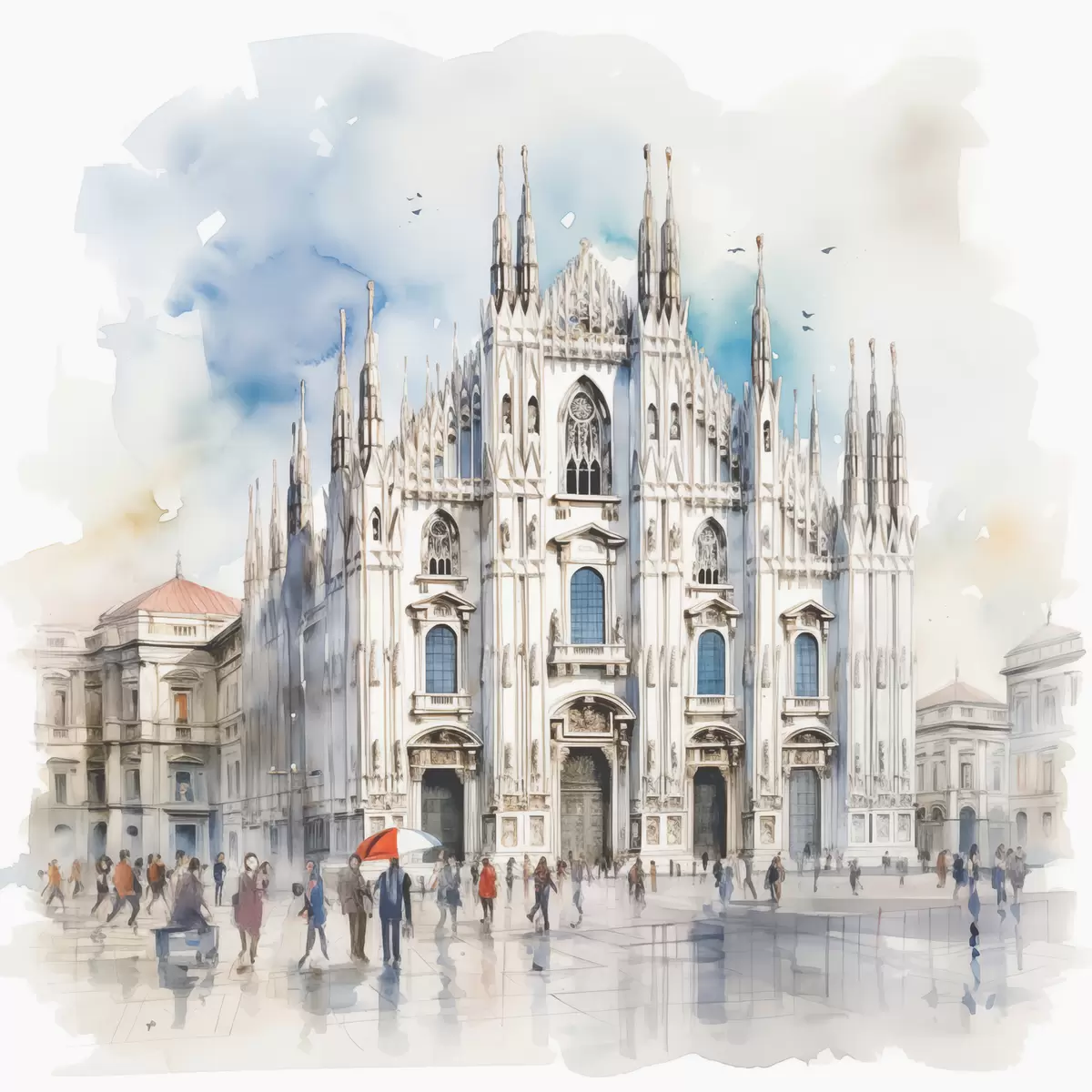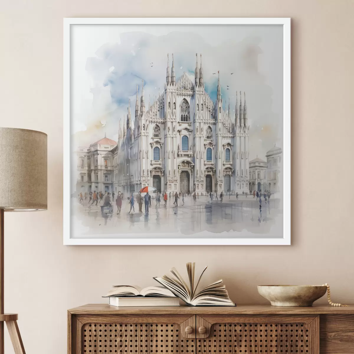 Affiche Duomo de Milan, architecture, ville, pluie, aquarelle, bleu, gris, gens qui marchent f38938