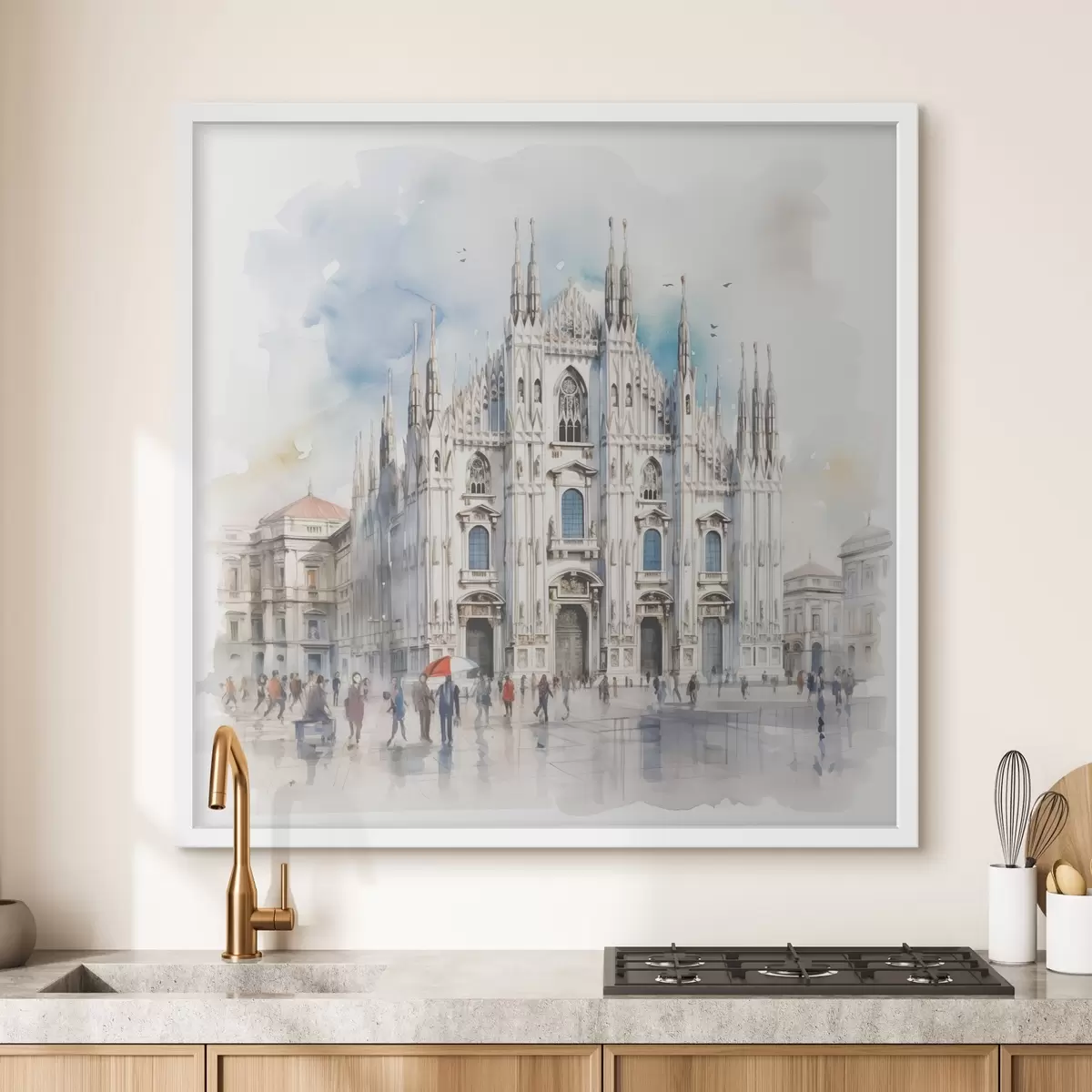Affiche Duomo de Milan, architecture, ville, pluie, aquarelle, bleu, gris, gens qui marchent Non f38938