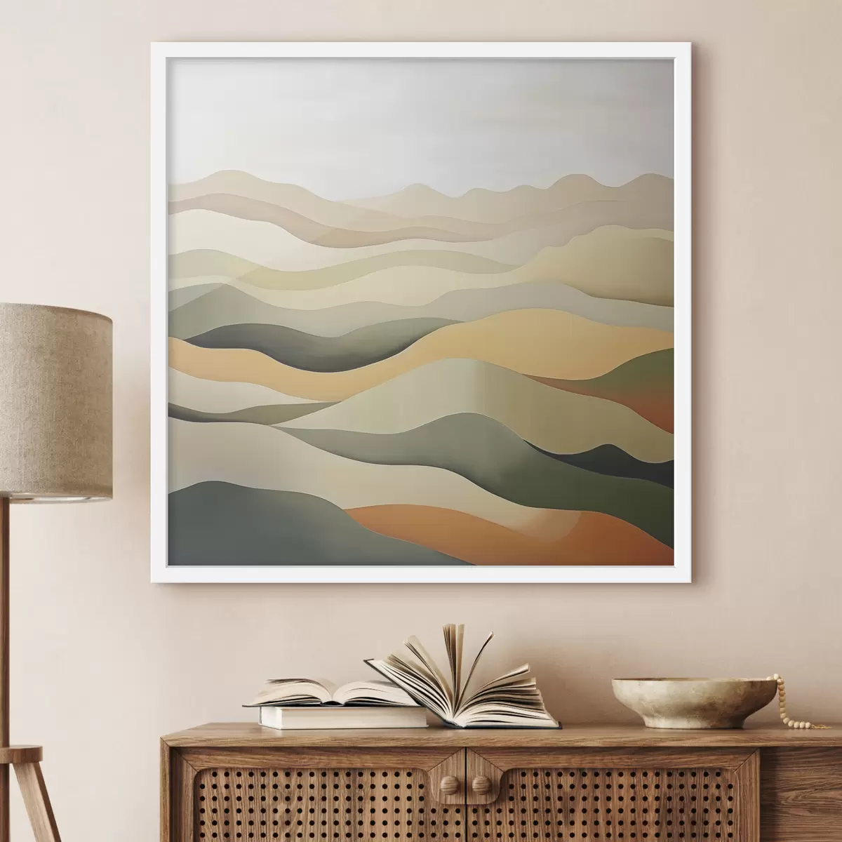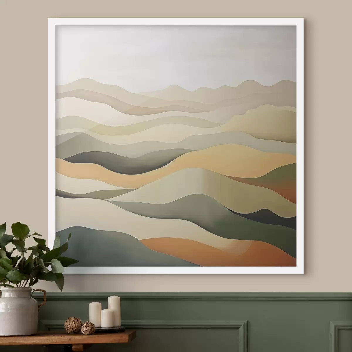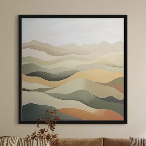 Affiche Collines, paysage abstrait, gouache, vert, ocre, sépia, gris f38952