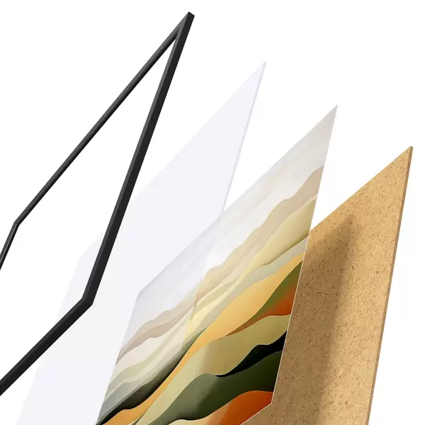 Le poster se compose d'un cadre, d'un plexiglas, d'une image imprimée et d'un support en aggloméré. Le poster peut être immédiatement accroché au mur grâce aux fixations au dos.