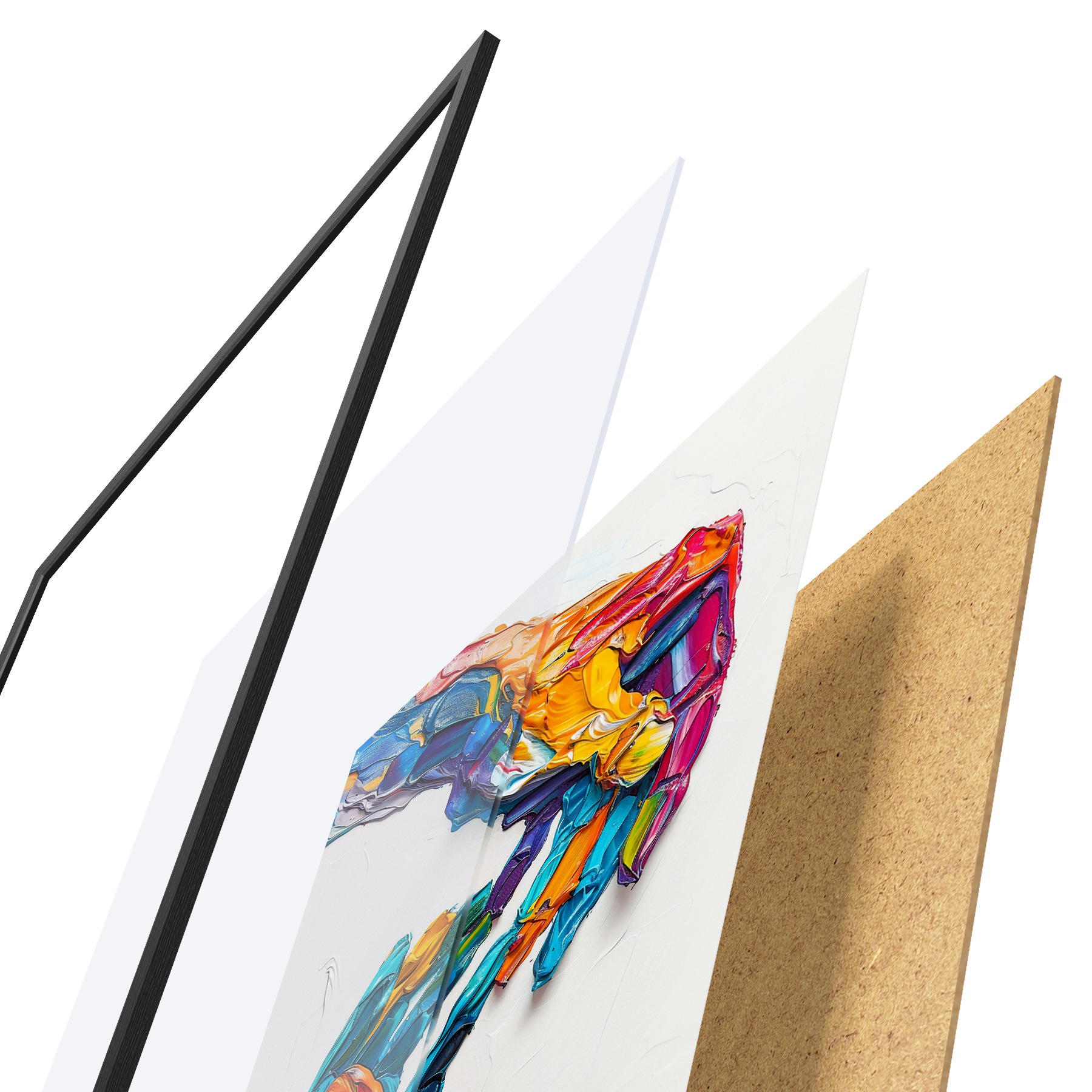 Le poster se compose d'un cadre, d'un plexiglas, d'une image imprimée et d'un support en aggloméré. Le poster peut être immédiatement accroché au mur grâce aux fixations au dos.