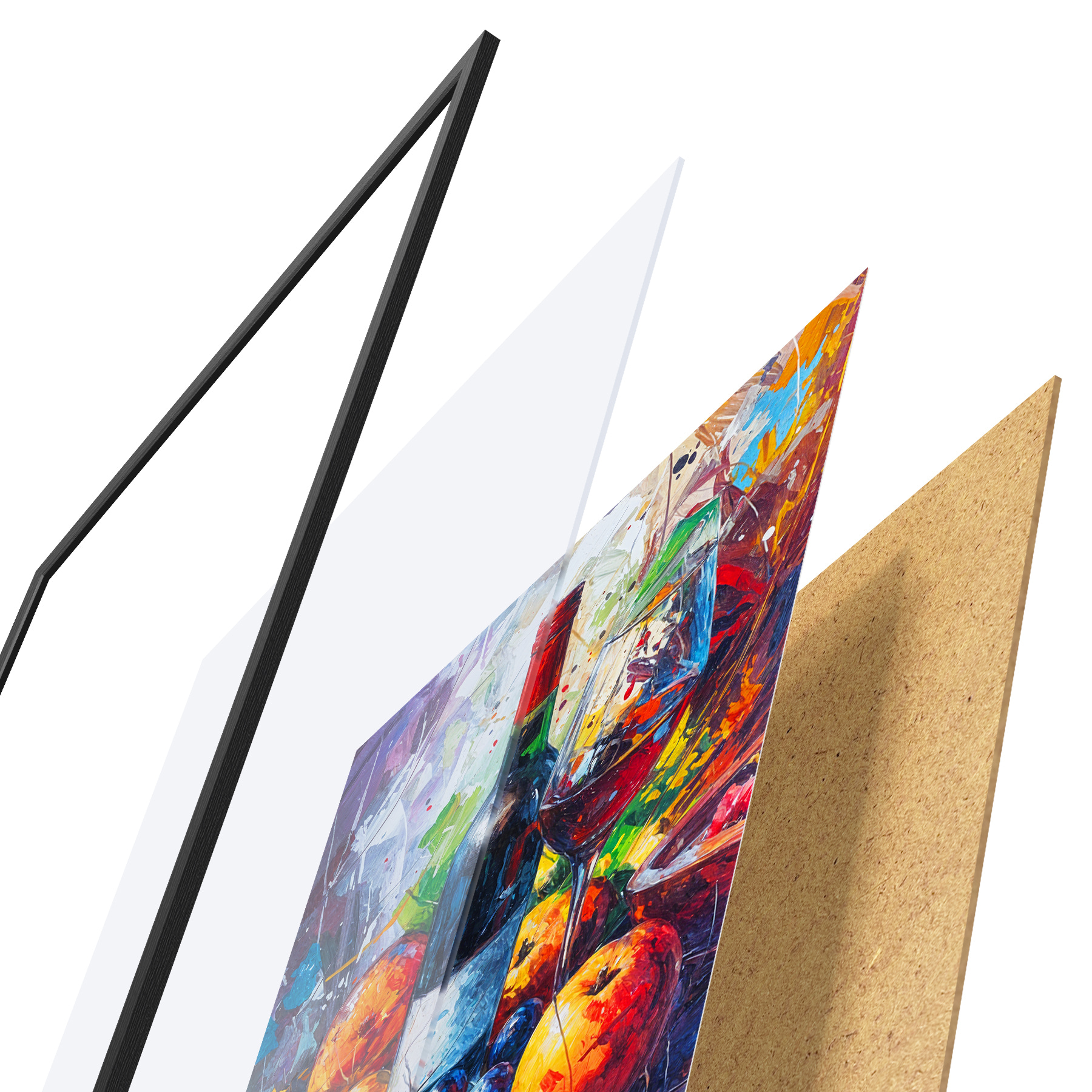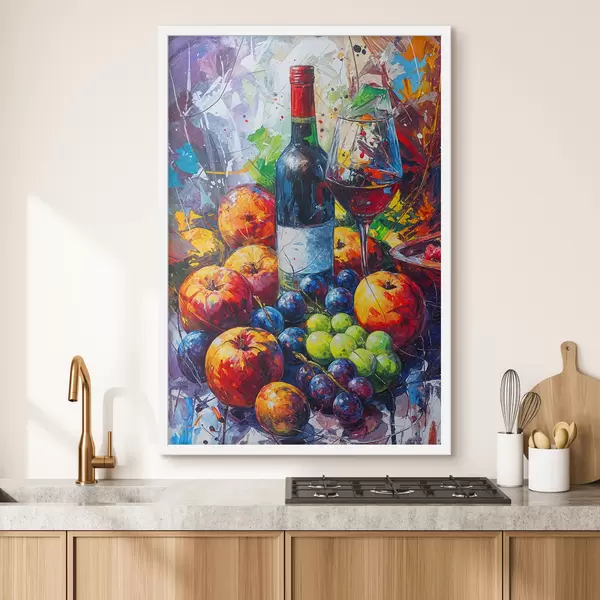 Affiche Peinture abstraite de nature morte représentant une bouteille de vin, un verre de vin et des fruits colorés avec des touches de différentes couleurs f38958