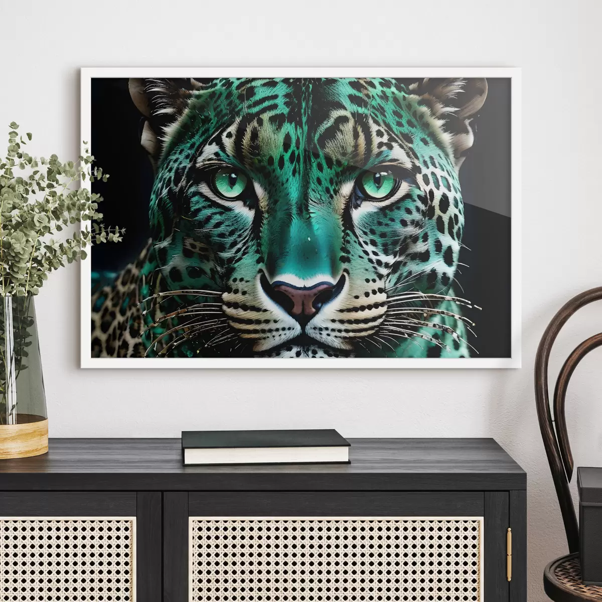 Affiche Un portrait en gros plan d'un féroce léopard aux yeux verts avec une fourrure tachetée de turquoise et de noir éclatant f38979