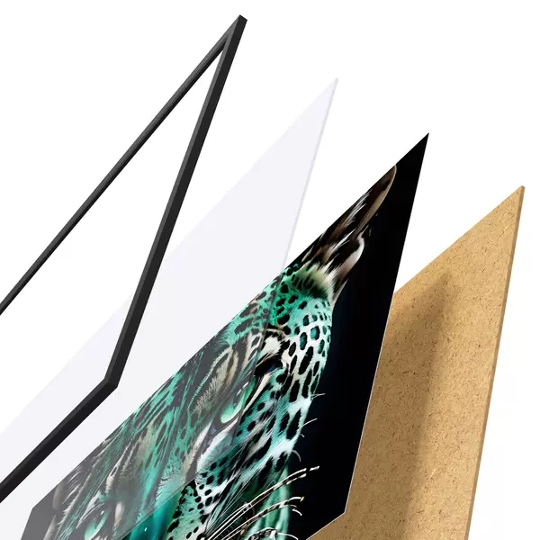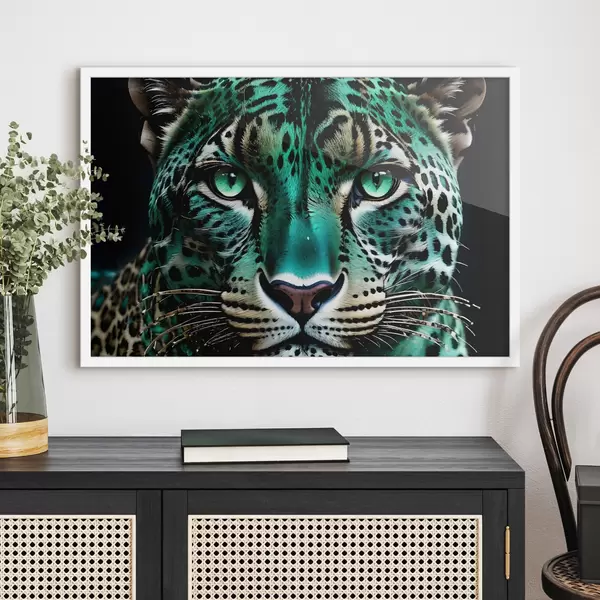 Affiche Un portrait en gros plan d'un féroce léopard aux yeux verts avec une fourrure tachetée de turquoise et de noir éclatant Non f38979