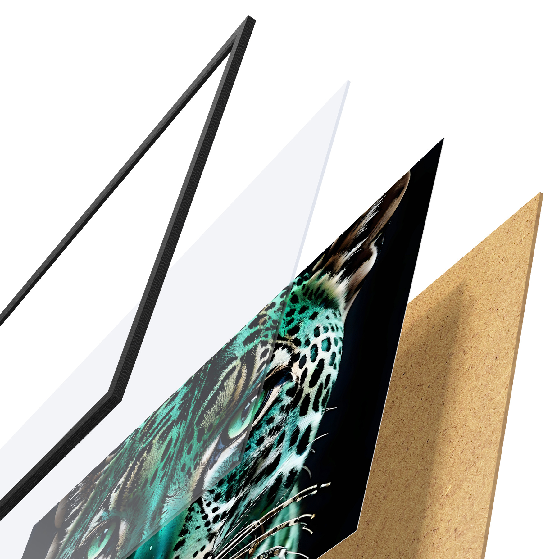 Le poster se compose d'un cadre, d'un plexiglas, d'une image imprimée et d'un support en aggloméré. Le poster peut être immédiatement accroché au mur grâce aux fixations au dos.