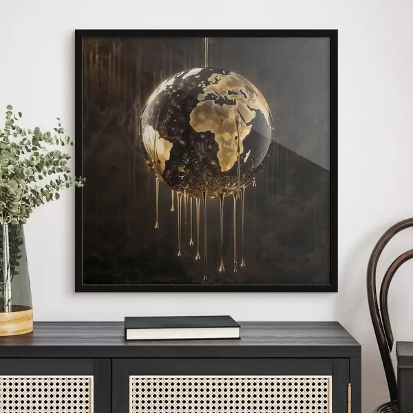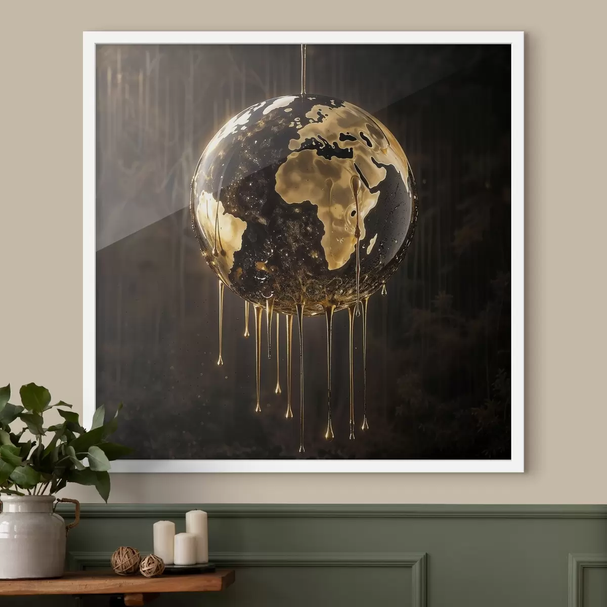 Affiche Une boule incandescente représentant la Terre entourée d'un liquide dégoulinant sur un fond sombre f38983