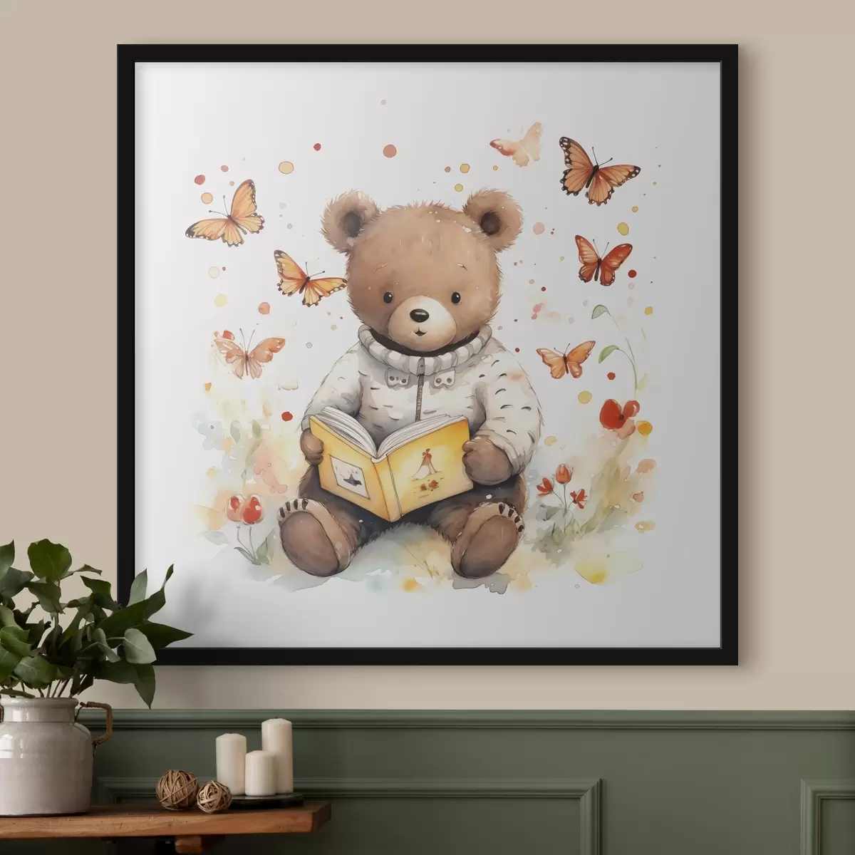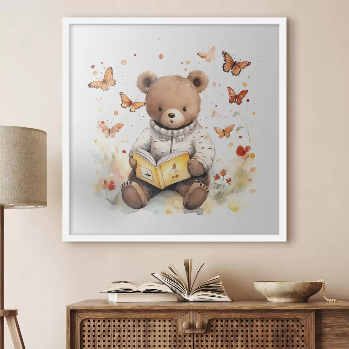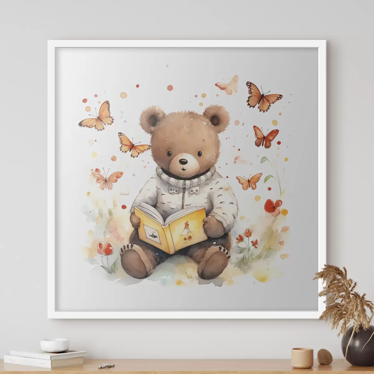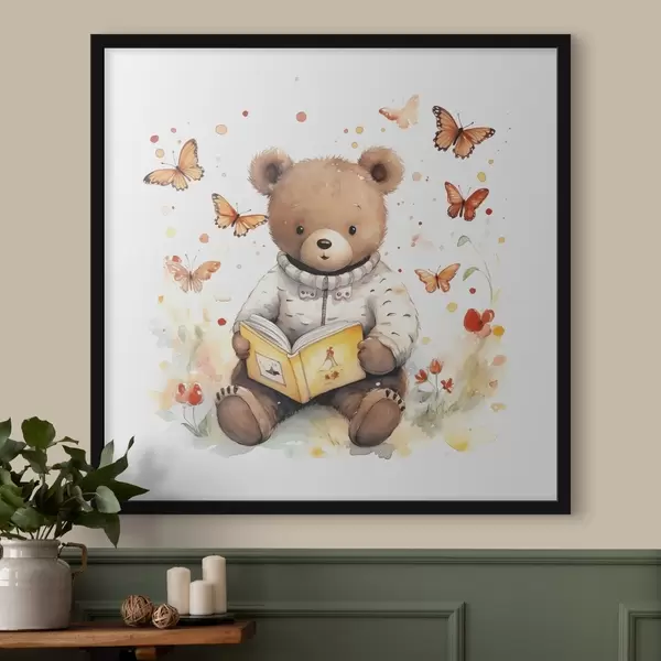 Affiche Un ours brun en pull-over lit un livre entouré de papillons aquarellés Non f39025