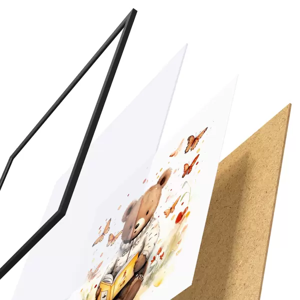 Le poster se compose d'un cadre, d'un plexiglas, d'une image imprimée et d'un support en aggloméré. Le poster peut être immédiatement accroché au mur grâce aux fixations au dos.