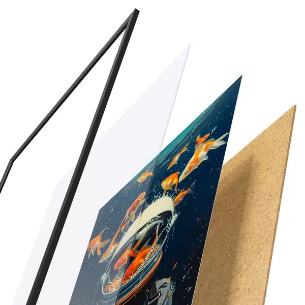 Le poster se compose d'un cadre, d'un plexiglas, d'une image imprimée et d'un support en aggloméré. Le poster peut être immédiatement accroché au mur grâce aux fixations au dos.