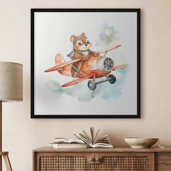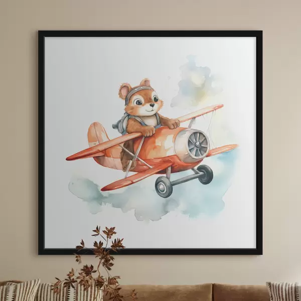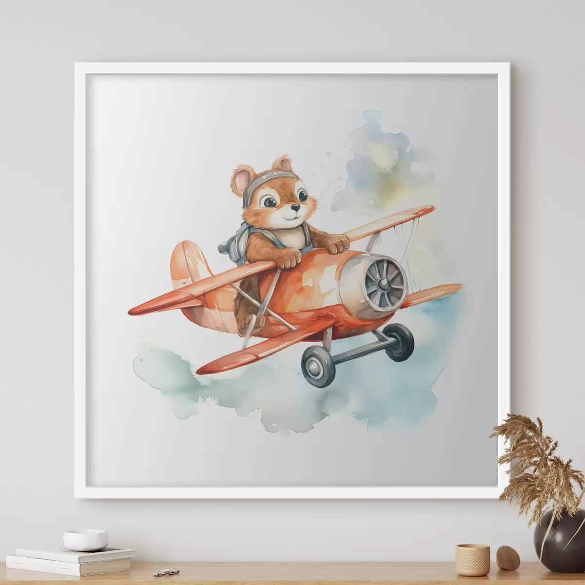 Affiche Un petit écureuil vole dans une illustration aquarelle pour enfants d'un avion rouge f39116