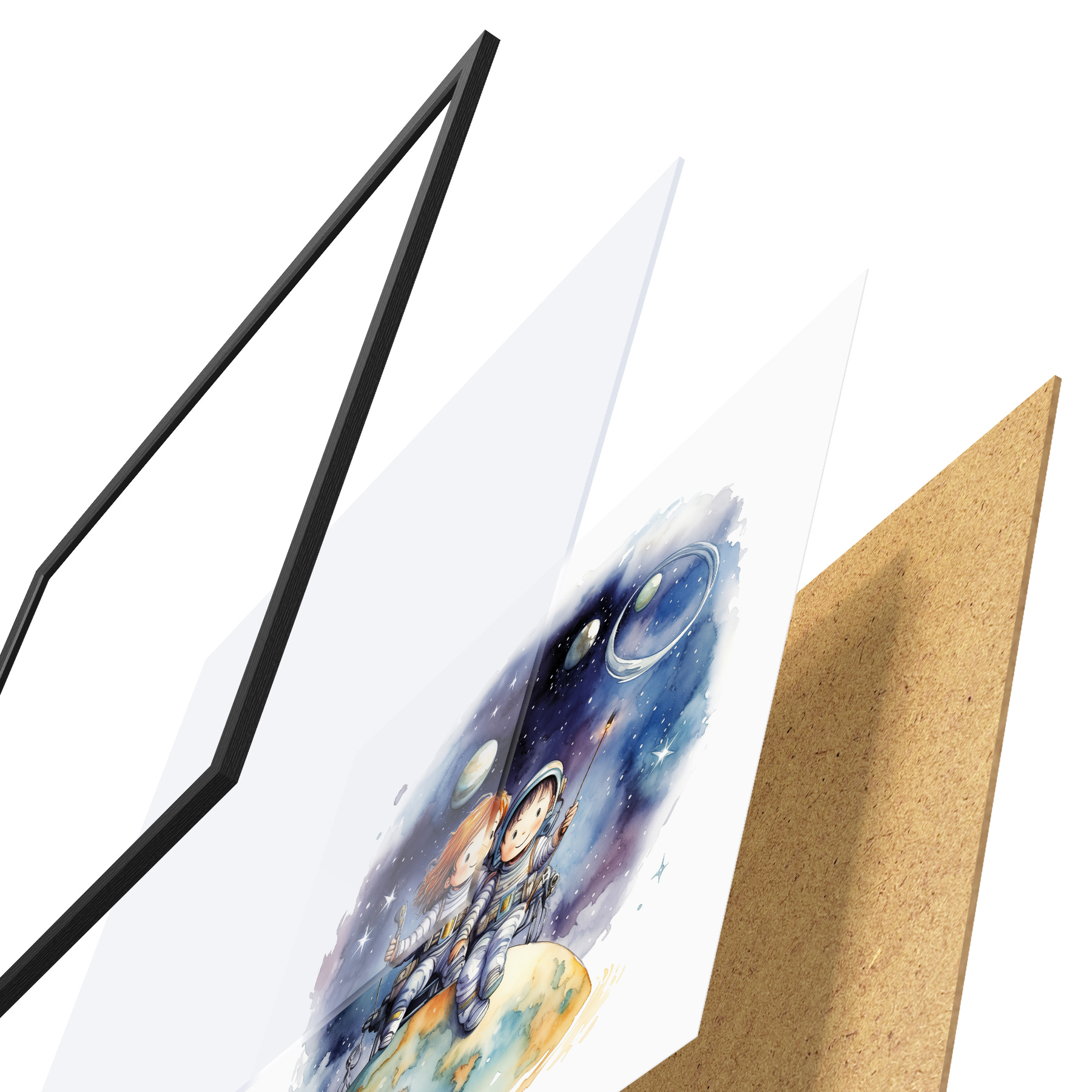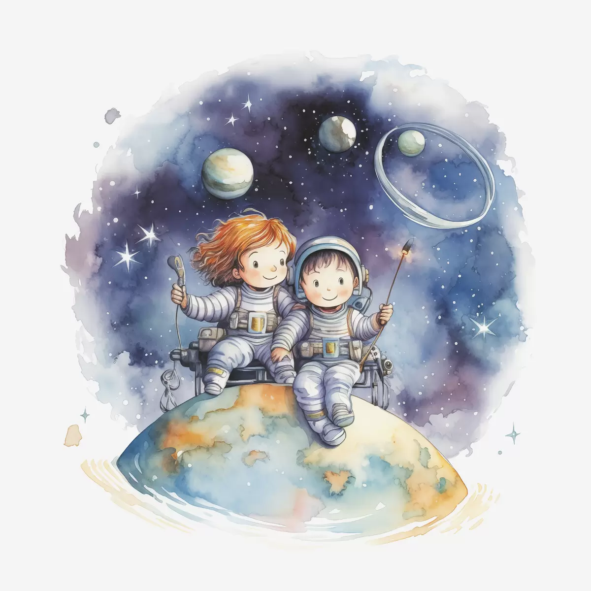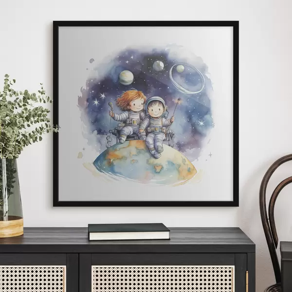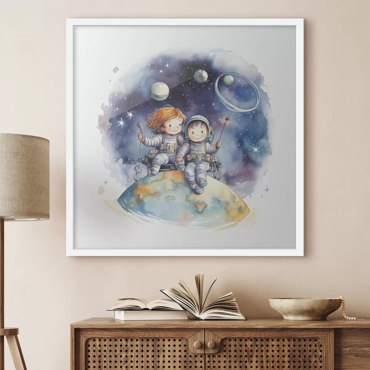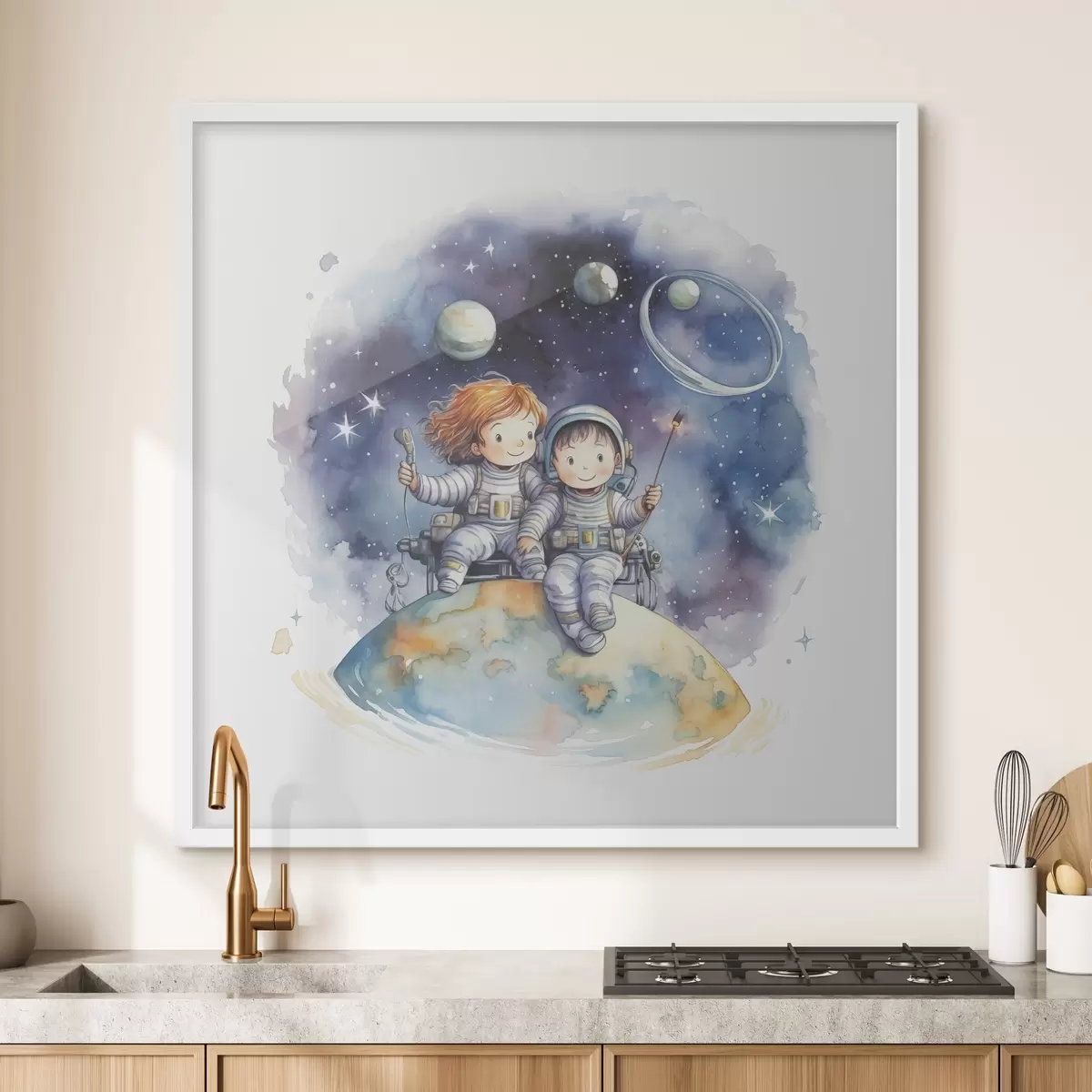 Affiche Des enfants en combinaison spatiale assis sur une planète dans l'espace illustration aquarelle pour enfants f39117