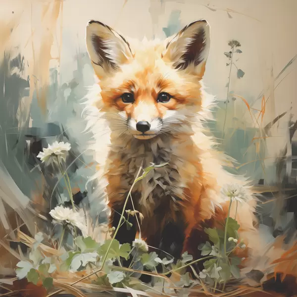 Affiche Renard roux assis dans l'herbe sèche sur fond vert. Peinture à l'huile Non f39191