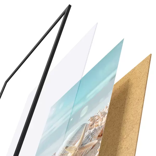 Le poster se compose d'un cadre, d'un plexiglas, d'une image imprimée et d'un support en aggloméré. Le poster peut être immédiatement accroché au mur grâce aux fixations au dos.