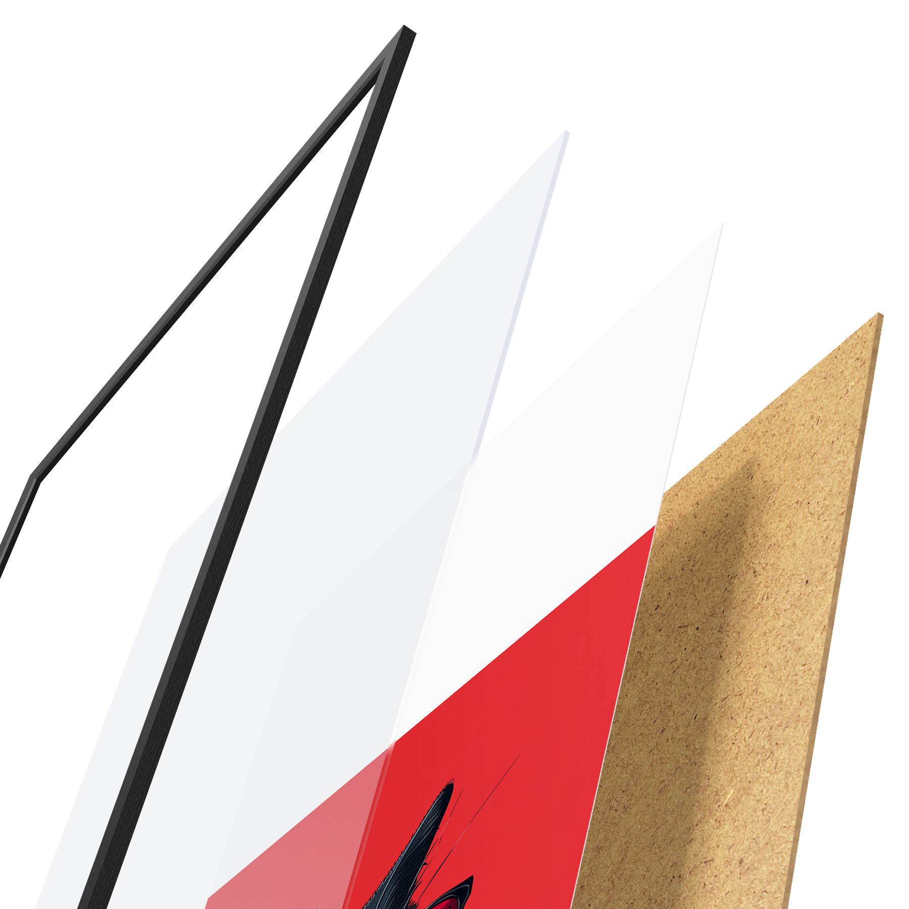 Le poster se compose d'un cadre, d'un plexiglas, d'une image imprimée et d'un support en aggloméré. Le poster peut être immédiatement accroché au mur grâce aux fixations au dos.