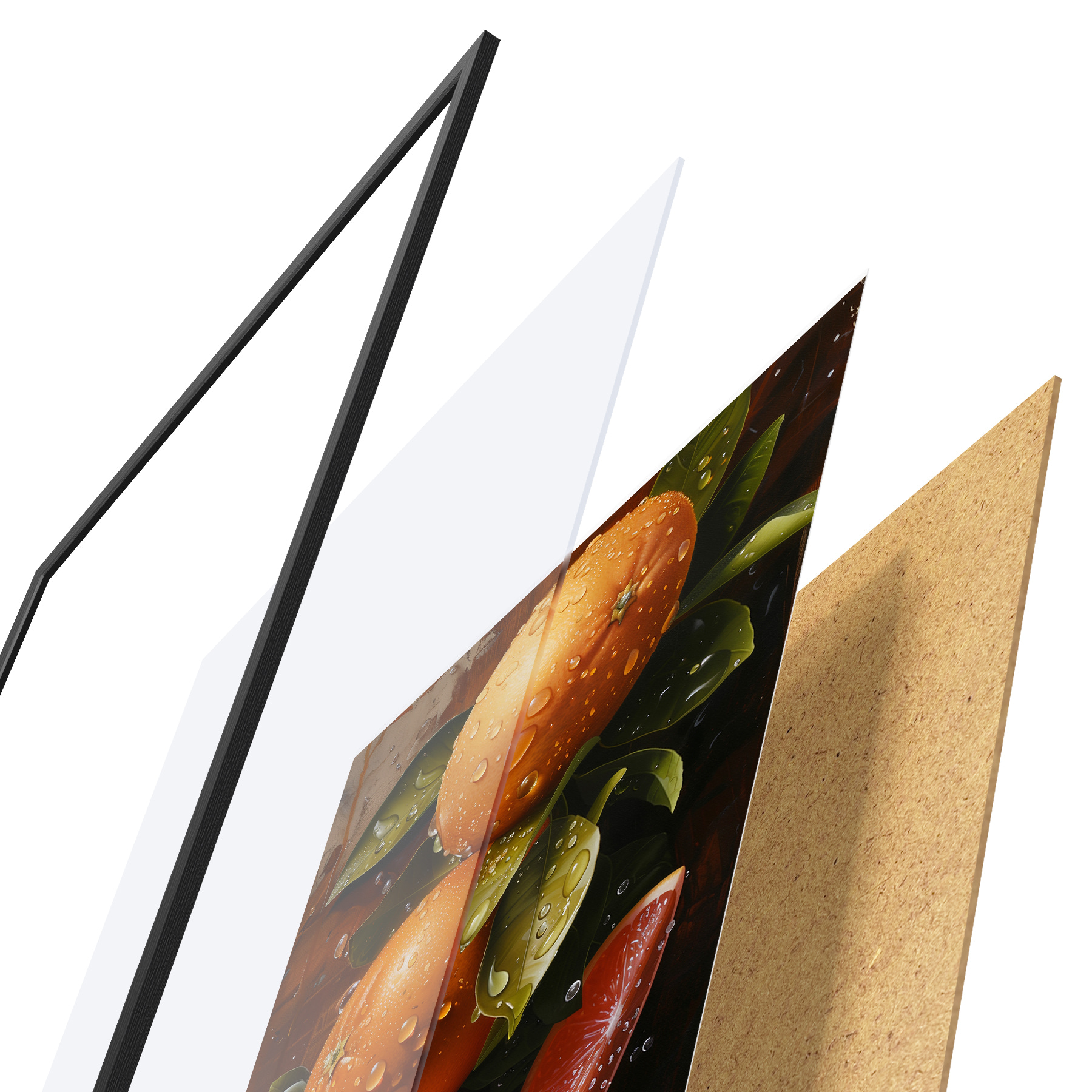 Le poster se compose d'un cadre, d'un plexiglas, d'une image imprimée et d'un support en aggloméré. Le poster peut être immédiatement accroché au mur grâce aux fixations au dos.