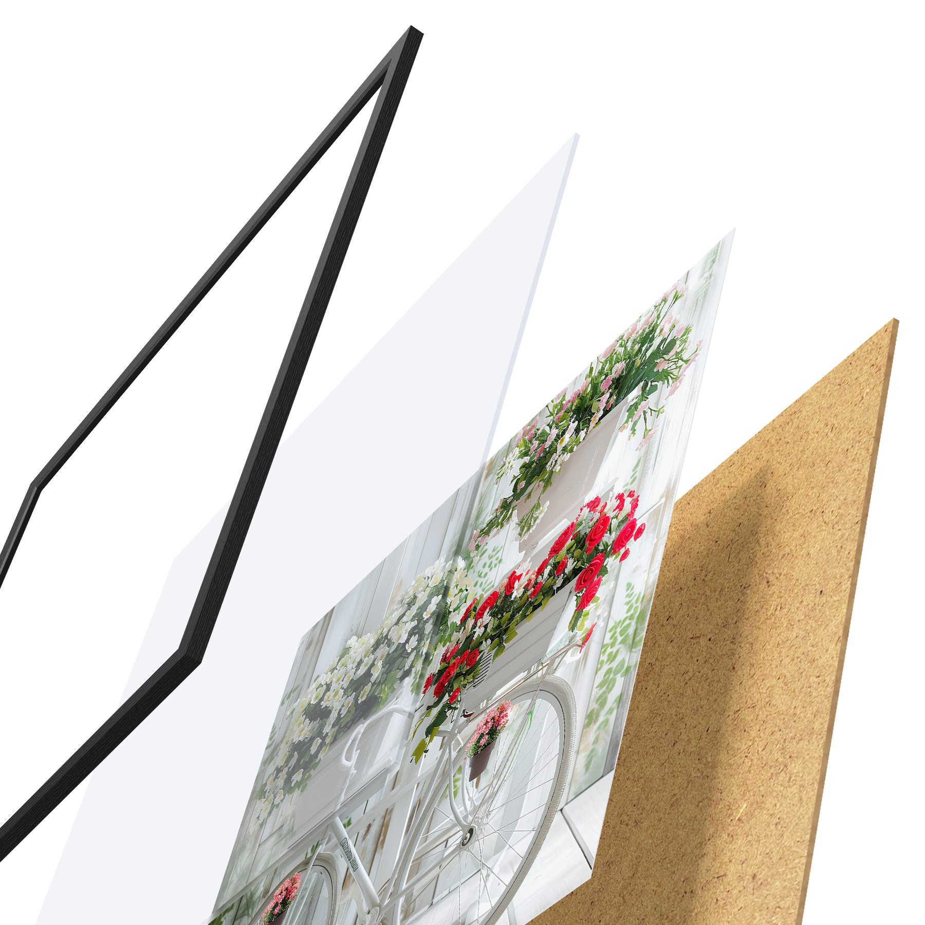 Le poster se compose d'un cadre, d'un plexiglas, d'une image imprimée et d'un support en aggloméré. Le poster peut être immédiatement accroché au mur grâce aux fixations au dos.