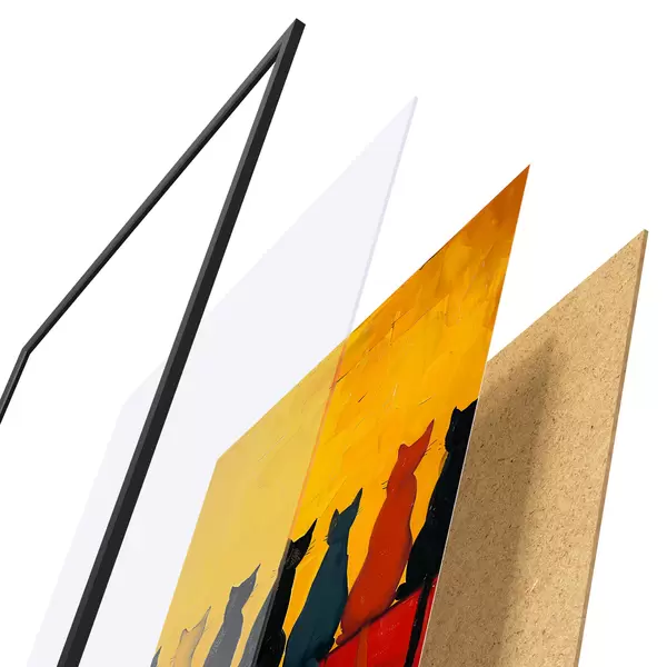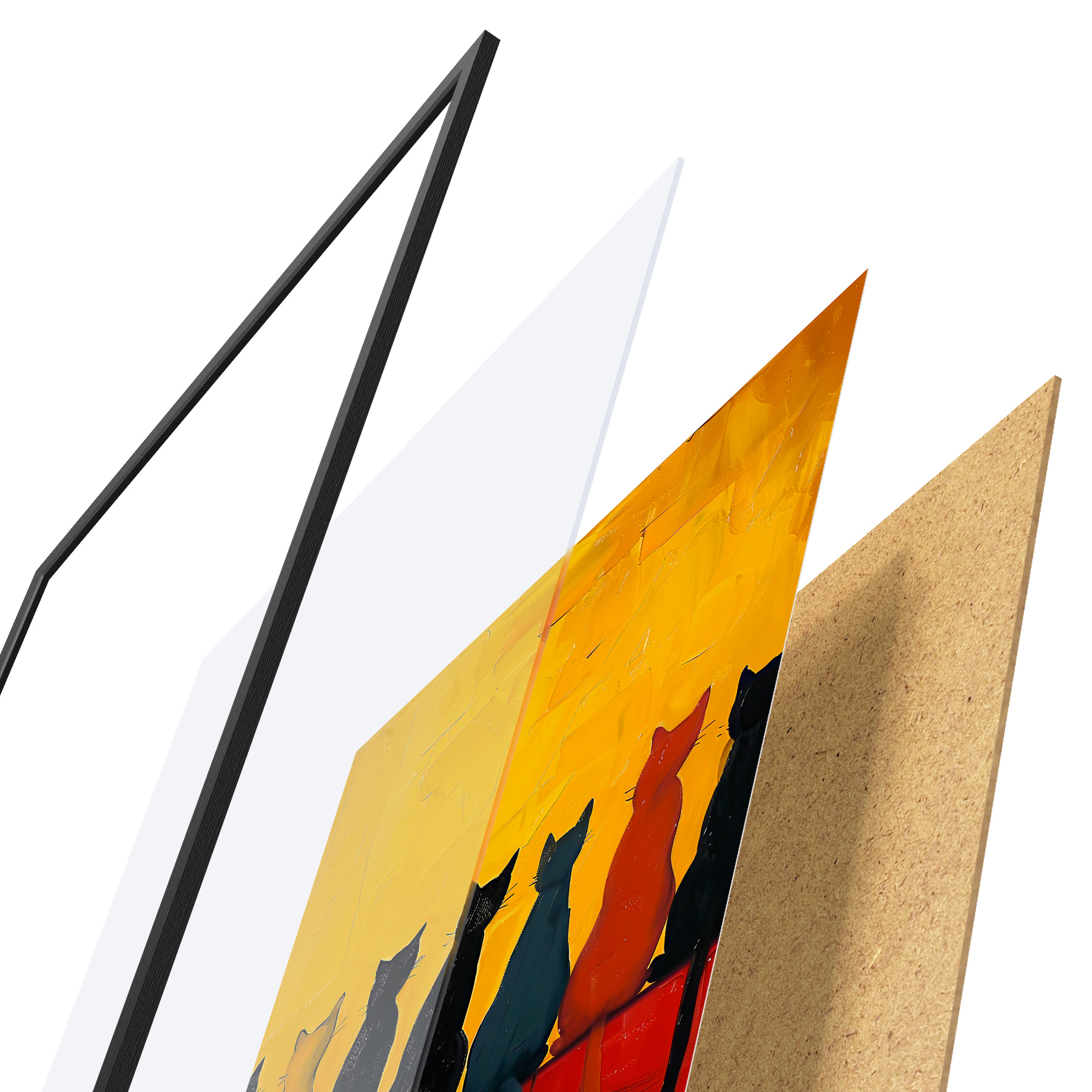 Le poster se compose d'un cadre, d'un plexiglas, d'une image imprimée et d'un support en aggloméré. Le poster peut être immédiatement accroché au mur grâce aux fixations au dos.