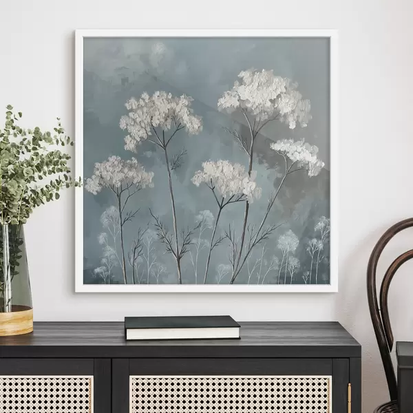 Affiche une peinture à l'huile représentant de délicates fleurs blanches sur un fond bleu Non f39325