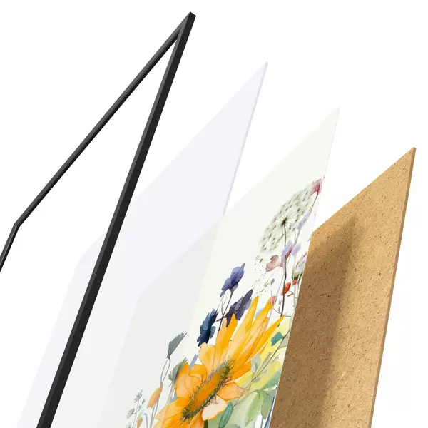 Le poster se compose d'un cadre, d'un plexiglas, d'une image imprimée et d'un support en aggloméré. Le poster peut être immédiatement accroché au mur grâce aux fixations au dos.