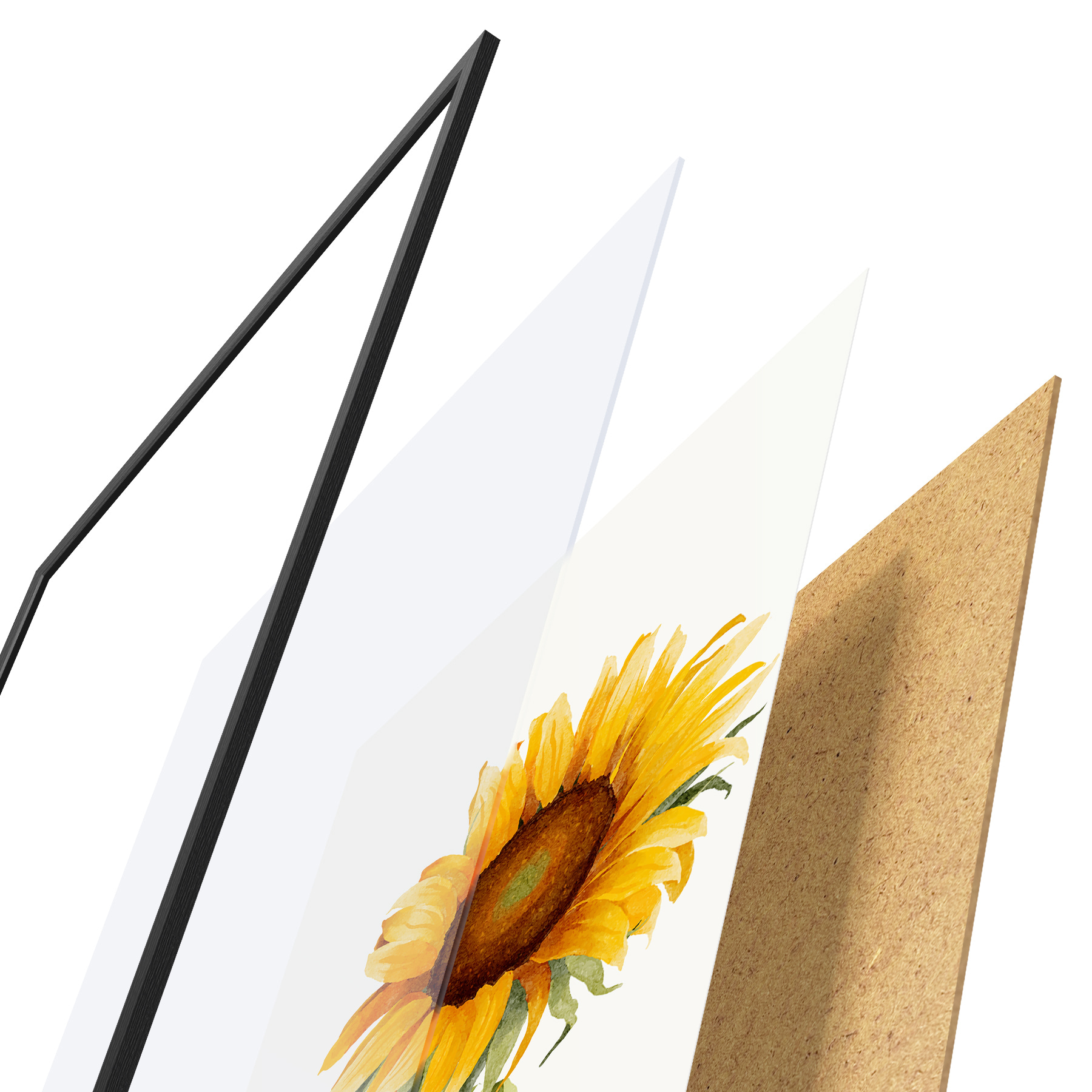 Le poster se compose d'un cadre, d'un plexiglas, d'une image imprimée et d'un support en aggloméré. Le poster peut être immédiatement accroché au mur grâce aux fixations au dos.