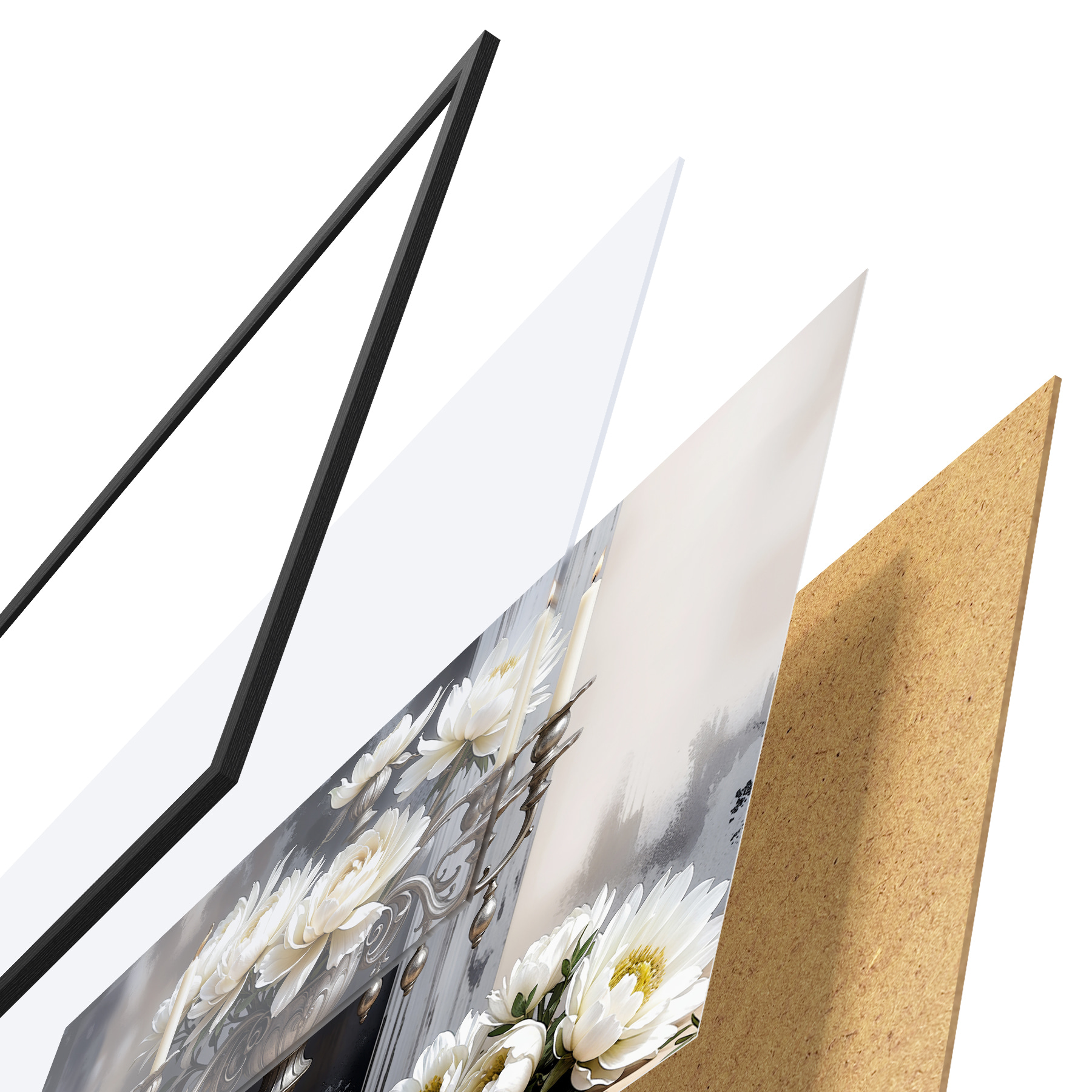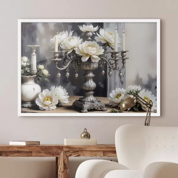 Affiche Un bouquet de grandes fleurs de dahlia blanches dans un vase argenté orné, entouré de bougies allumées sur une table en bois f39384