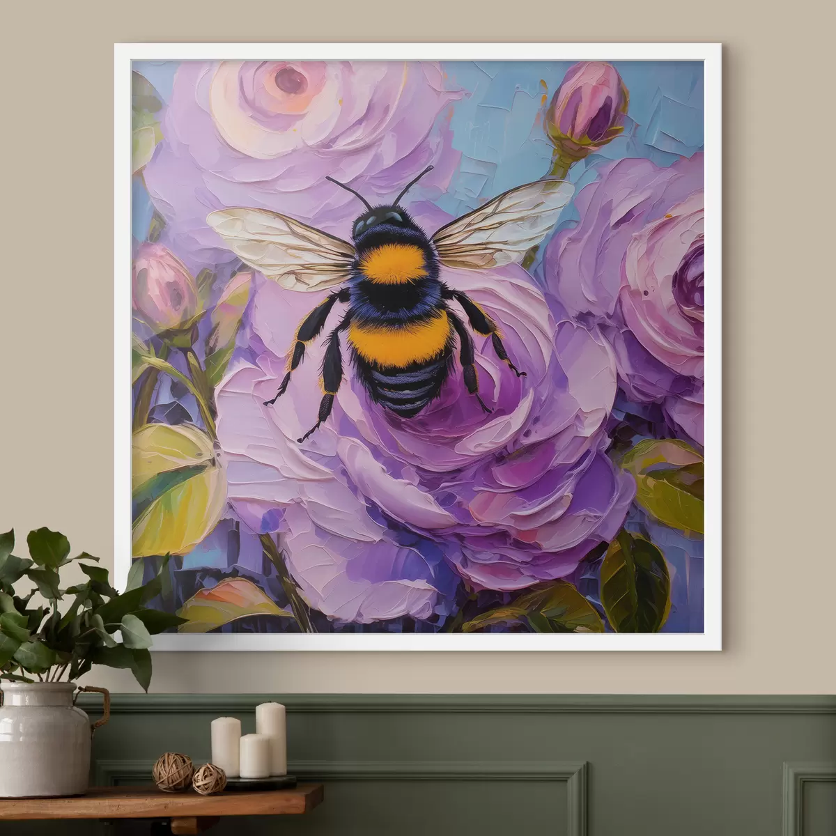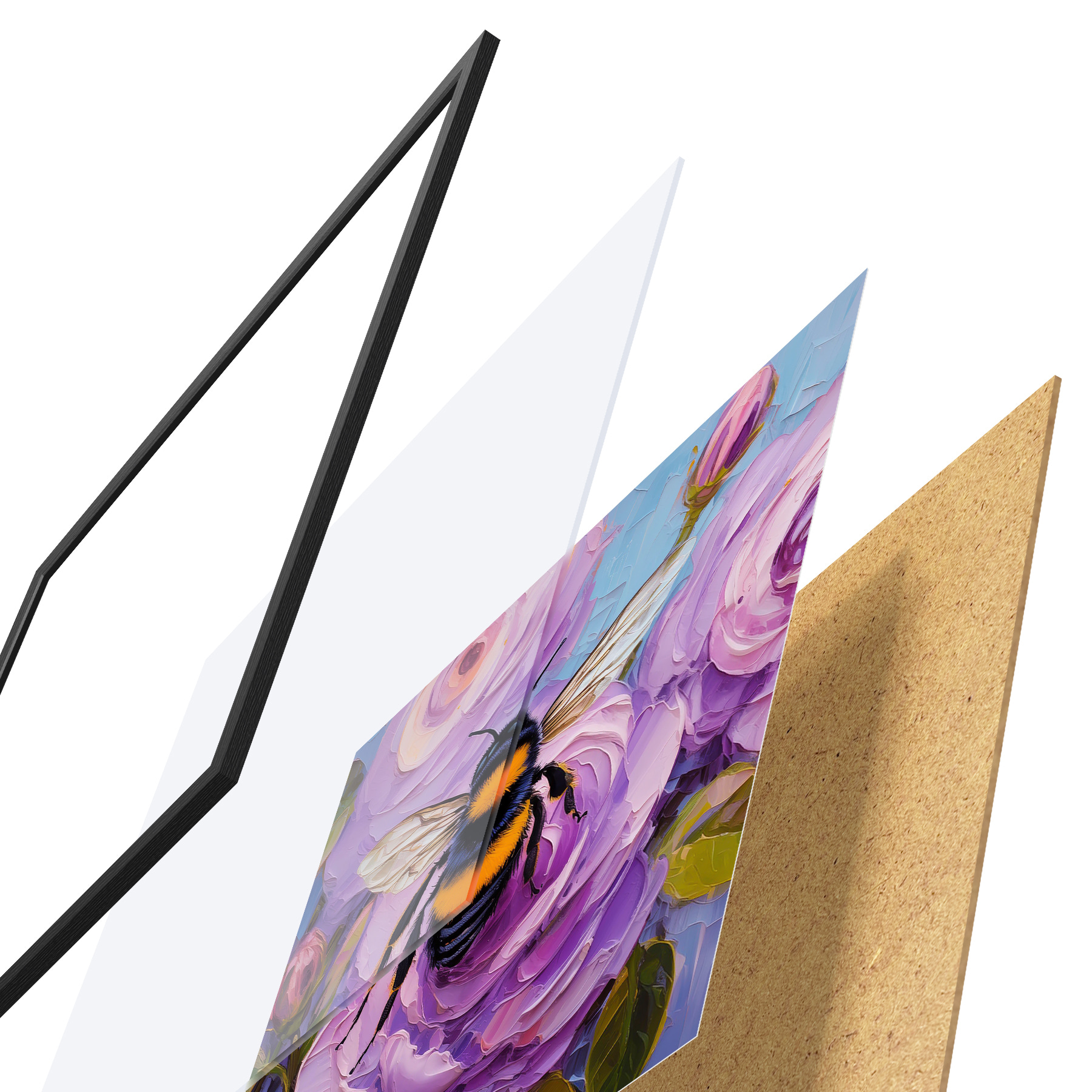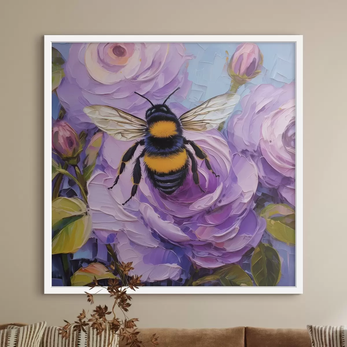 Affiche Abeille sur pivoines roses, fleurs d'été colorées, peinture à l'huile, coups de pinceau vifs Non f39411