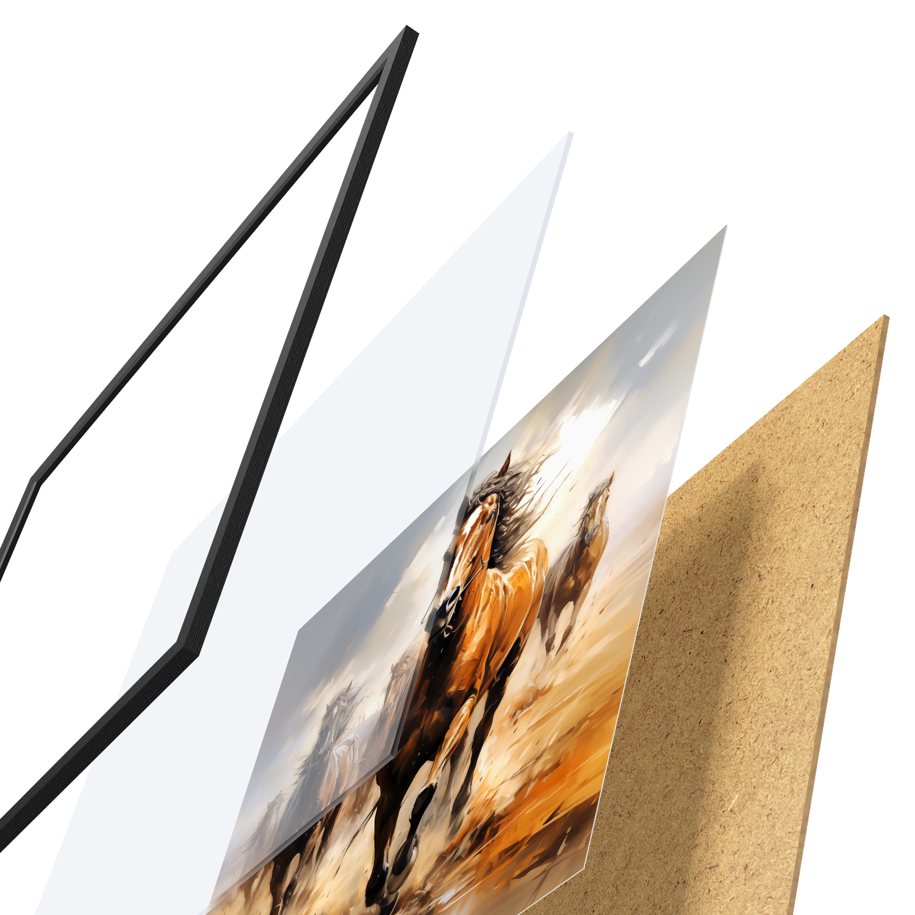 Le poster se compose d'un cadre, d'un plexiglas, d'une image imprimée et d'un support en aggloméré. Le poster peut être immédiatement accroché au mur grâce aux fixations au dos.