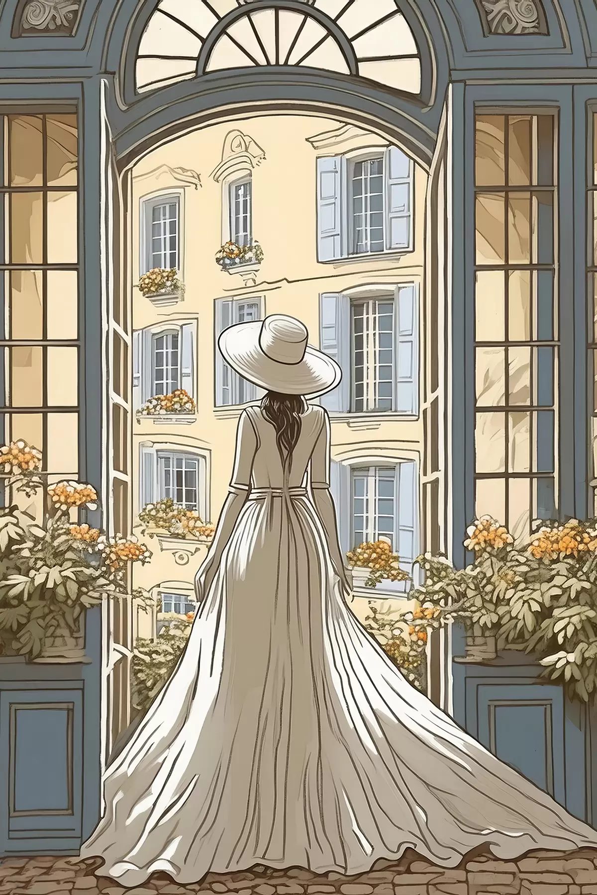 Affiche silhouette d'une jeune fille vêtue d'une robe blanche près de la fenêtre Non f39479