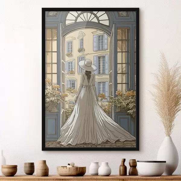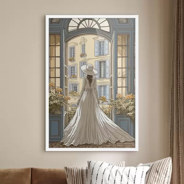 Affiche silhouette d'une jeune fille vêtue d'une robe blanche près de la fenêtre f39479