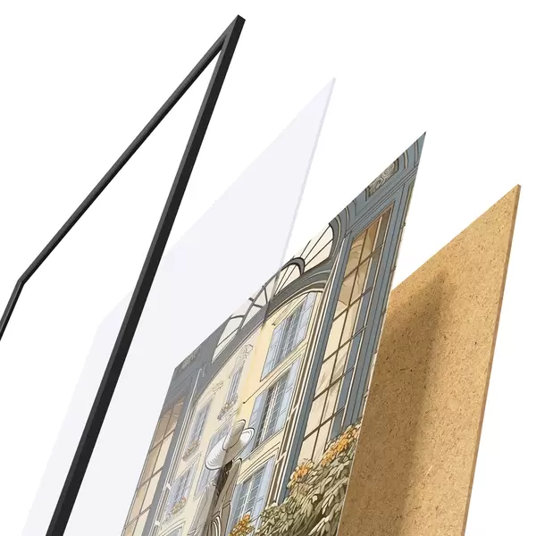 Le poster se compose d'un cadre, d'un plexiglas, d'une image imprimée et d'un support en aggloméré. Le poster peut être immédiatement accroché au mur grâce aux fixations au dos.