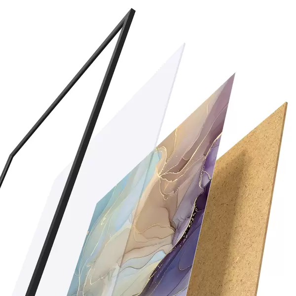 Le poster se compose d'un cadre, d'un plexiglas, d'une image imprimée et d'un support en aggloméré. Le poster peut être immédiatement accroché au mur grâce aux fixations au dos.