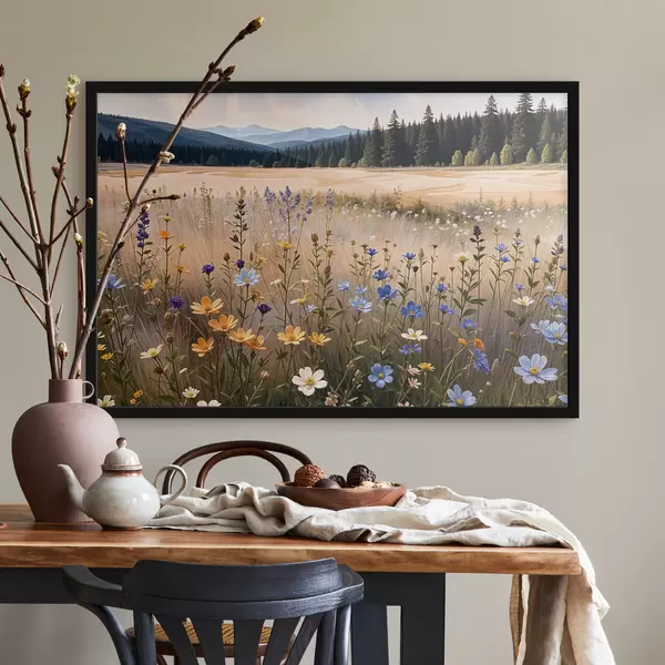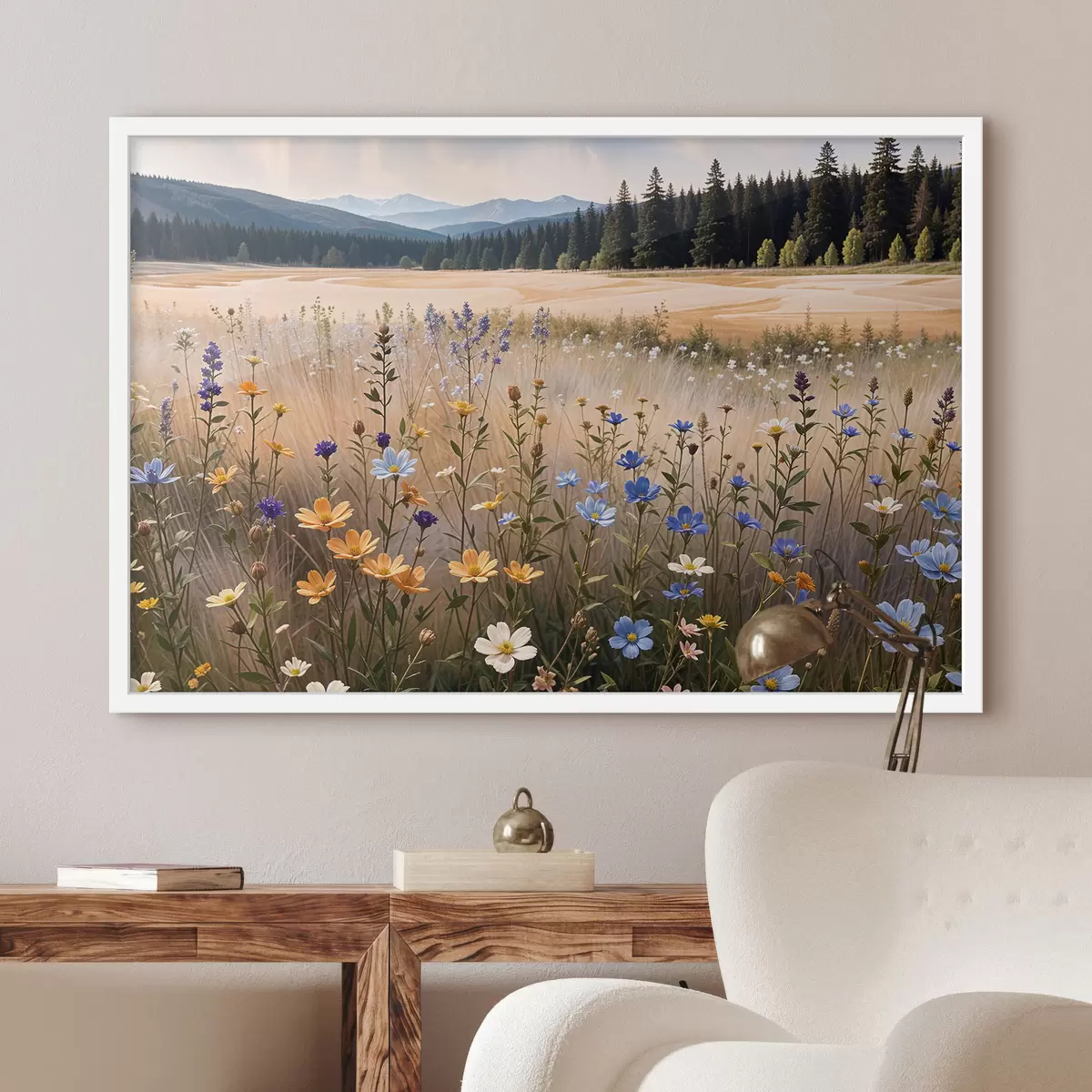 Affiche Un champ de fleurs sauvages colorées au premier plan, avec un lac et des montagnes en arrière-plan f39502