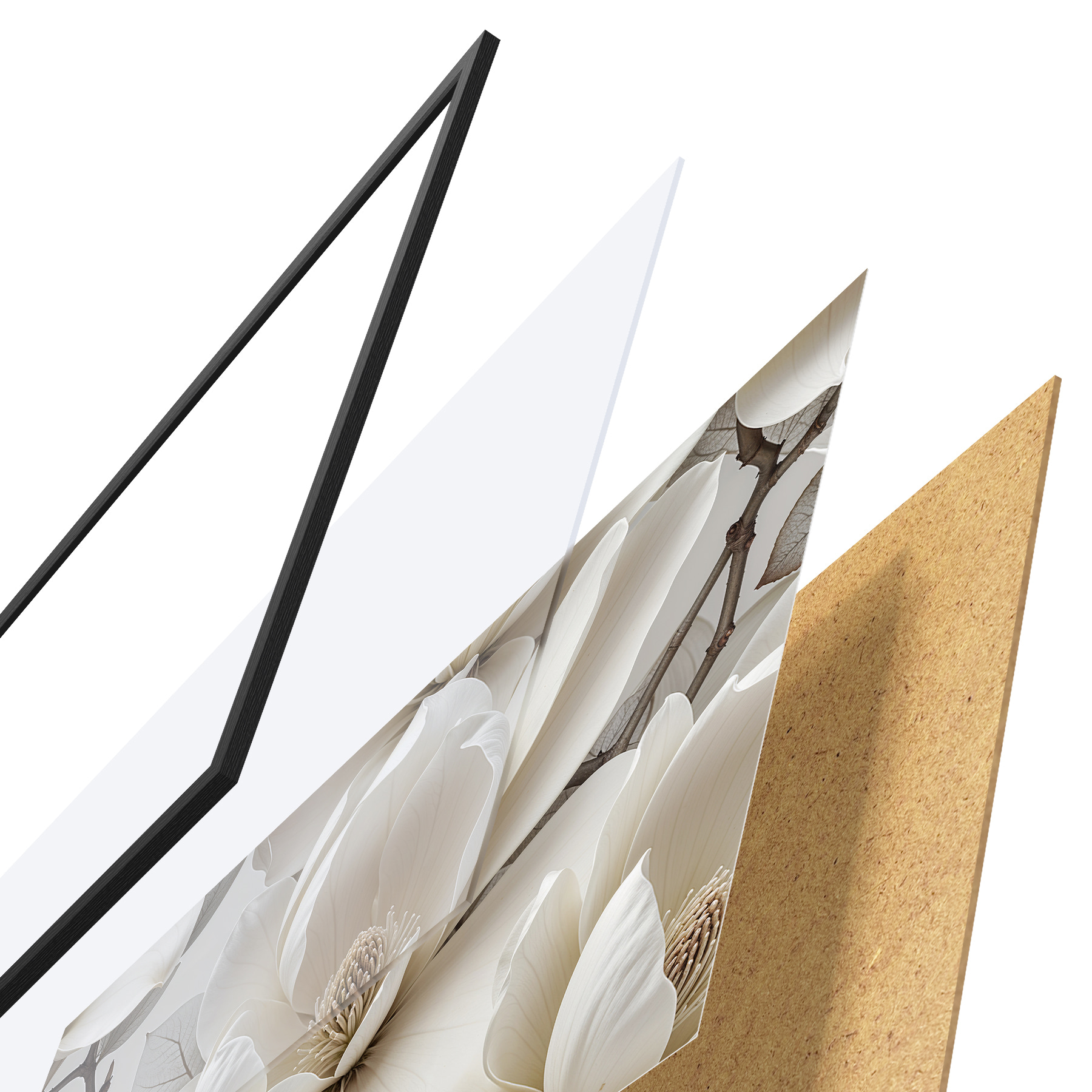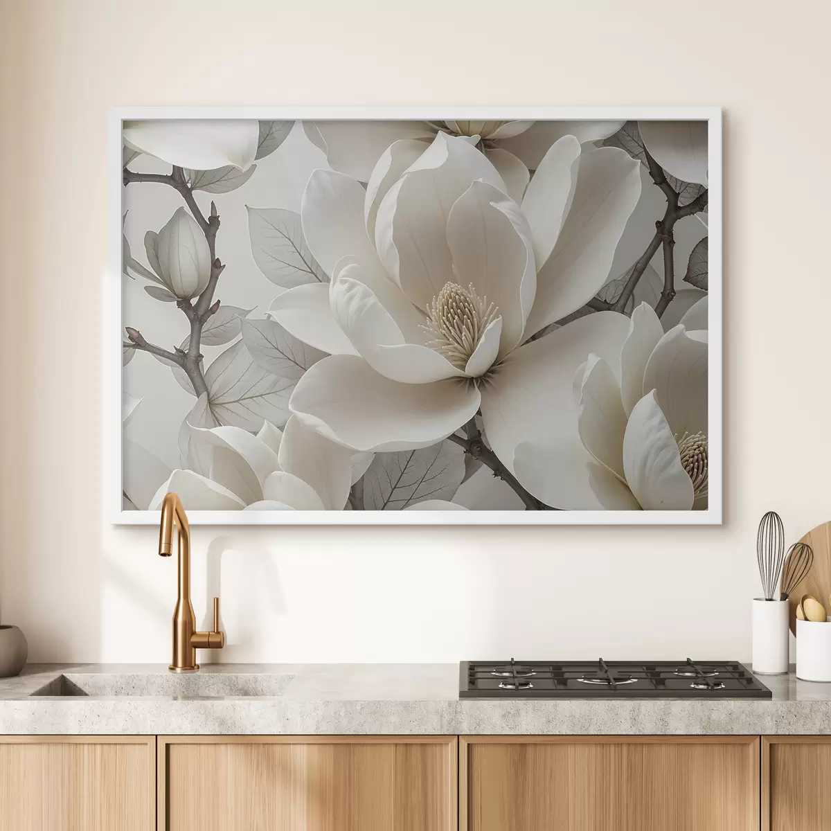 Affiche Fleur de magnolia blanche aux pétales délicats entourée de feuilles vertes sur fond clair Non f39527