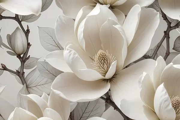 Affiche Fleur de magnolia blanche aux pétales délicats entourée de feuilles vertes sur fond clair Non f39527