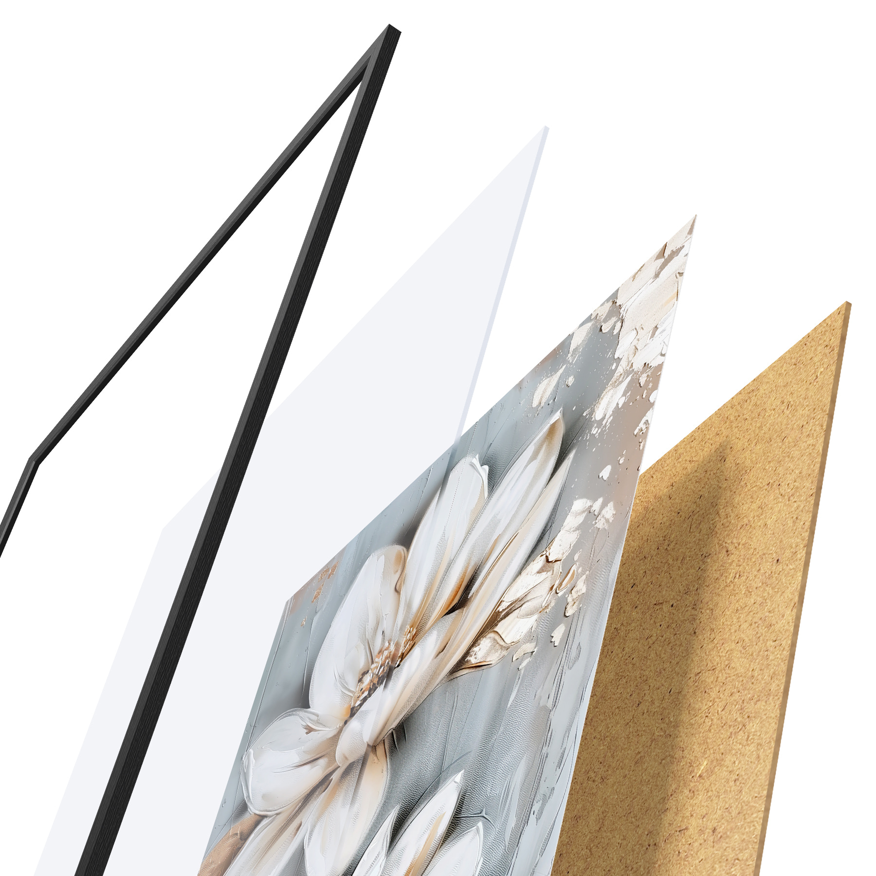 Le poster se compose d'un cadre, d'un plexiglas, d'une image imprimée et d'un support en aggloméré. Le poster peut être immédiatement accroché au mur grâce aux fixations au dos.