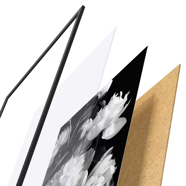 Le poster se compose d'un cadre, d'un plexiglas, d'une image imprimée et d'un support en aggloméré. Le poster peut être immédiatement accroché au mur grâce aux fixations au dos.