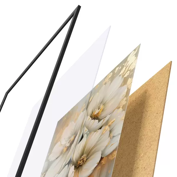 Le poster se compose d'un cadre, d'un plexiglas, d'une image imprimée et d'un support en aggloméré. Le poster peut être immédiatement accroché au mur grâce aux fixations au dos.