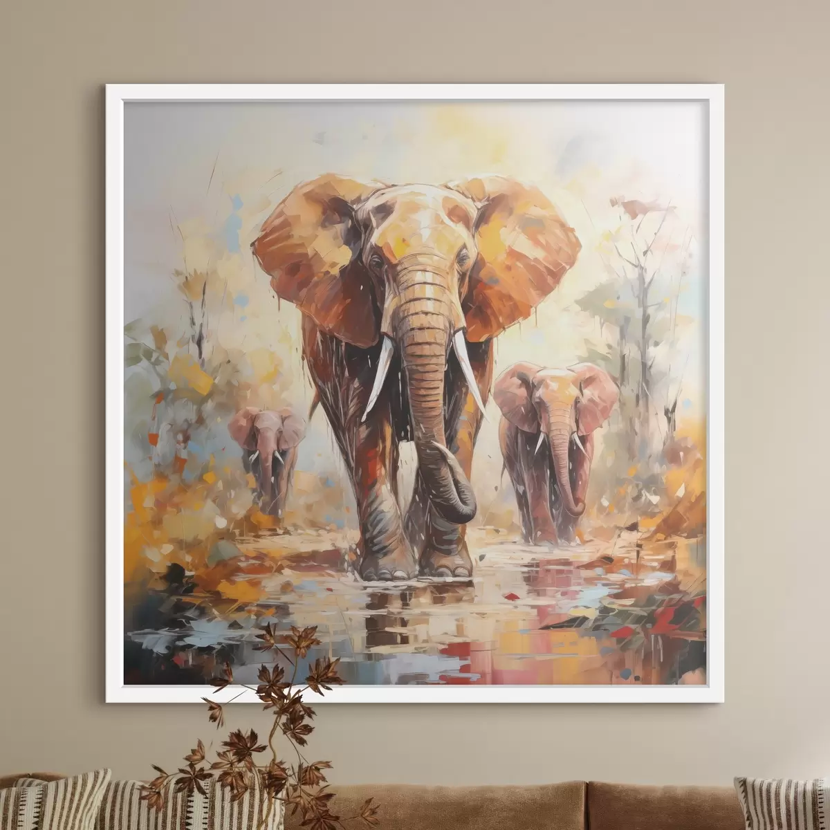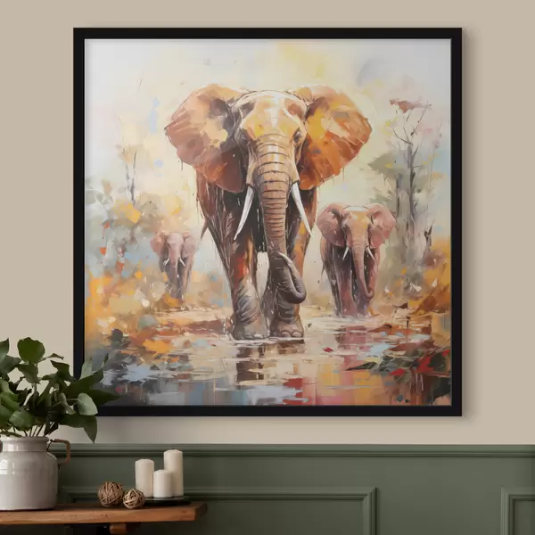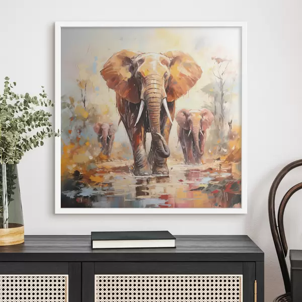 Affiche Troupeau d'éléphants dans la savane, peinture à l'huile, art abstrait f39573