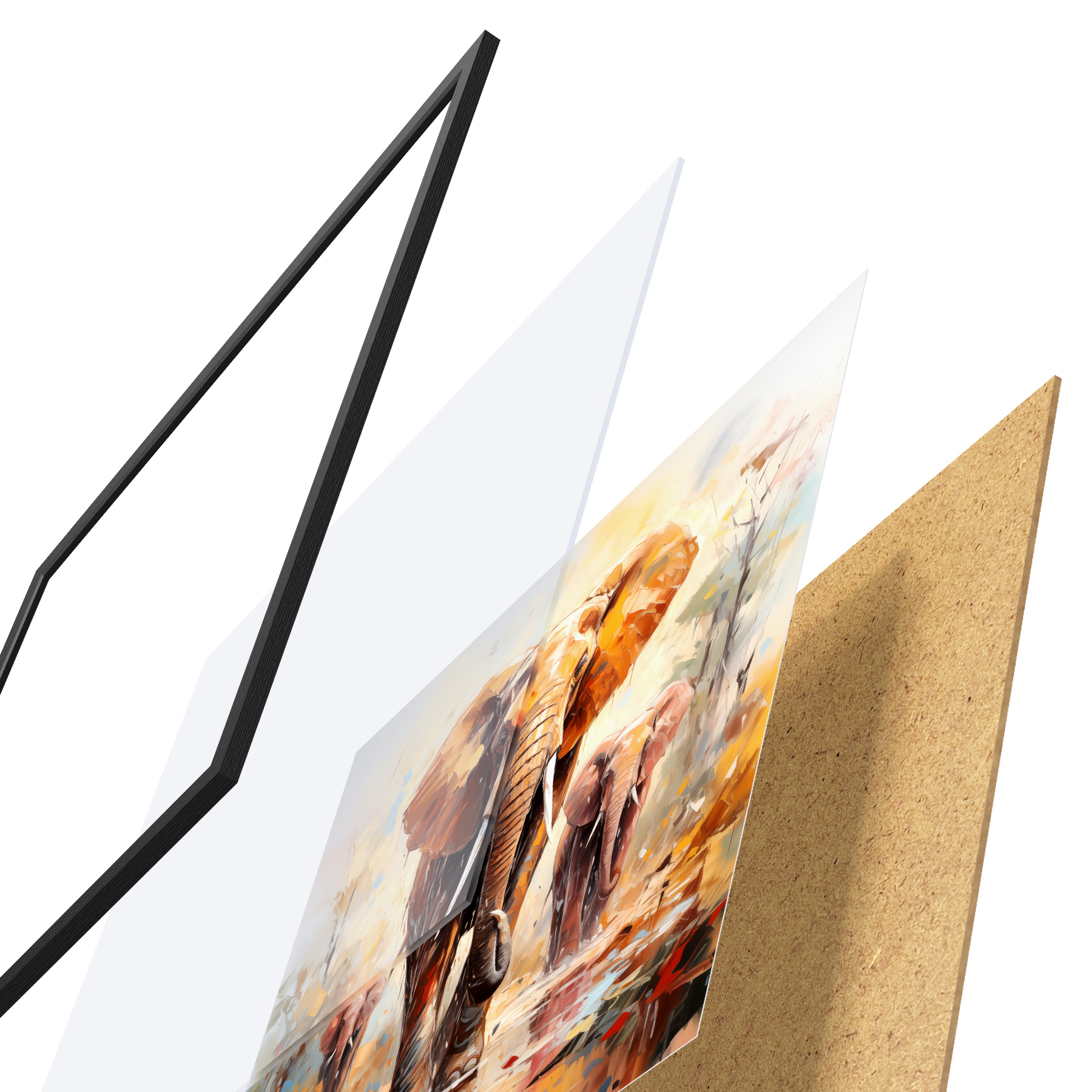 Le poster se compose d'un cadre, d'un plexiglas, d'une image imprimée et d'un support en aggloméré. Le poster peut être immédiatement accroché au mur grâce aux fixations au dos.